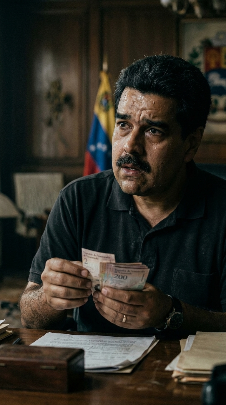 Strong rule: style --- Кинематографический реализм, стиль сериала Netf... ---. Николас Мадуро сидит и считает . С удивлением спрашивает Character appearance reference (MUST match exactly): - Николас Мадуро: Strong rule: style --- Кинематографический реализм, стиль сериала Netf... ---. Гиперреалистичный портрет Николаса Мадуро, мужчина средних лет, около 60 лет, с характерными усами, слегка взлохмаченными черными волосами. Тревожное, обеспокоенное выражение лица, капли пота на лбу. Одет в простую, немного поношенную темную рубашку-поло. Крупный план, драматическое боковое освещение, глубокие тени.