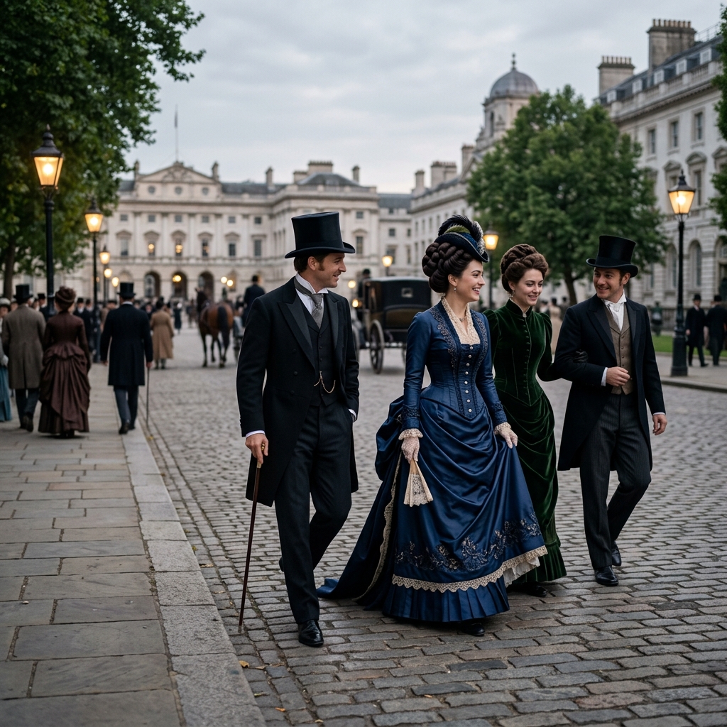 Strong rule: style --- Cinematic, hyperrealistic, 8K, photorealistic, ... ---. Men in tailcoats and top hats, women in elegant long dresses with corsets and elaborate hairstyles, strolling gracefully. 19th-century aristocratic fashion.