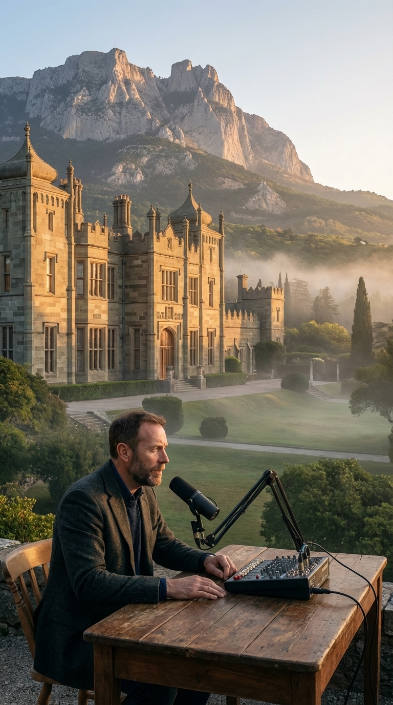 Strong rule: style --- Cinematic, hyperrealistic, 8K, photorealistic, ... ---. Эпичный панорамный вид на Воронцовский дворец на рассвете. Мягкий золотой свет освещает его стены, на заднем плане величественно возвышается гора Ай-Петри. Легкая утренняя дымка стелется по парку. Стиль - премиальный тревел-контент, высокая детализация.