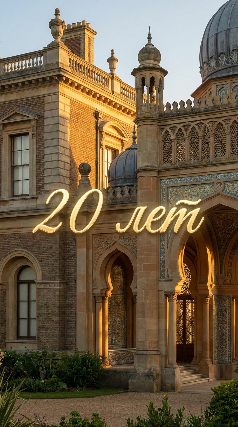 Strong rule: style --- Cinematic, hyperrealistic, 8K, photorealistic, ... ---. Средний план, показывающий фасад дворца, сочетающий английский и восточный стили. Солнечные лучи красиво подчеркивают архитектурные детали. Текст "20 лет" появляется на экране, выделенный элегантным шрифтом.