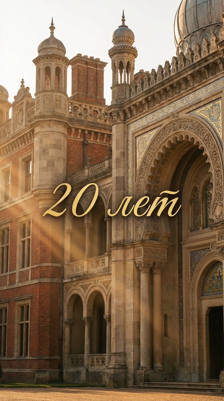 Strong rule: style --- Cinematic, hyperrealistic, 8K, photorealistic, ... ---. Средний план, показывающий фасад дворца, сочетающий английский и восточный стили. Солнечные лучи красиво подчеркивают архитектурные детали. Текст "20 лет" появляется на экране, выделенный элегантным шрифтом.