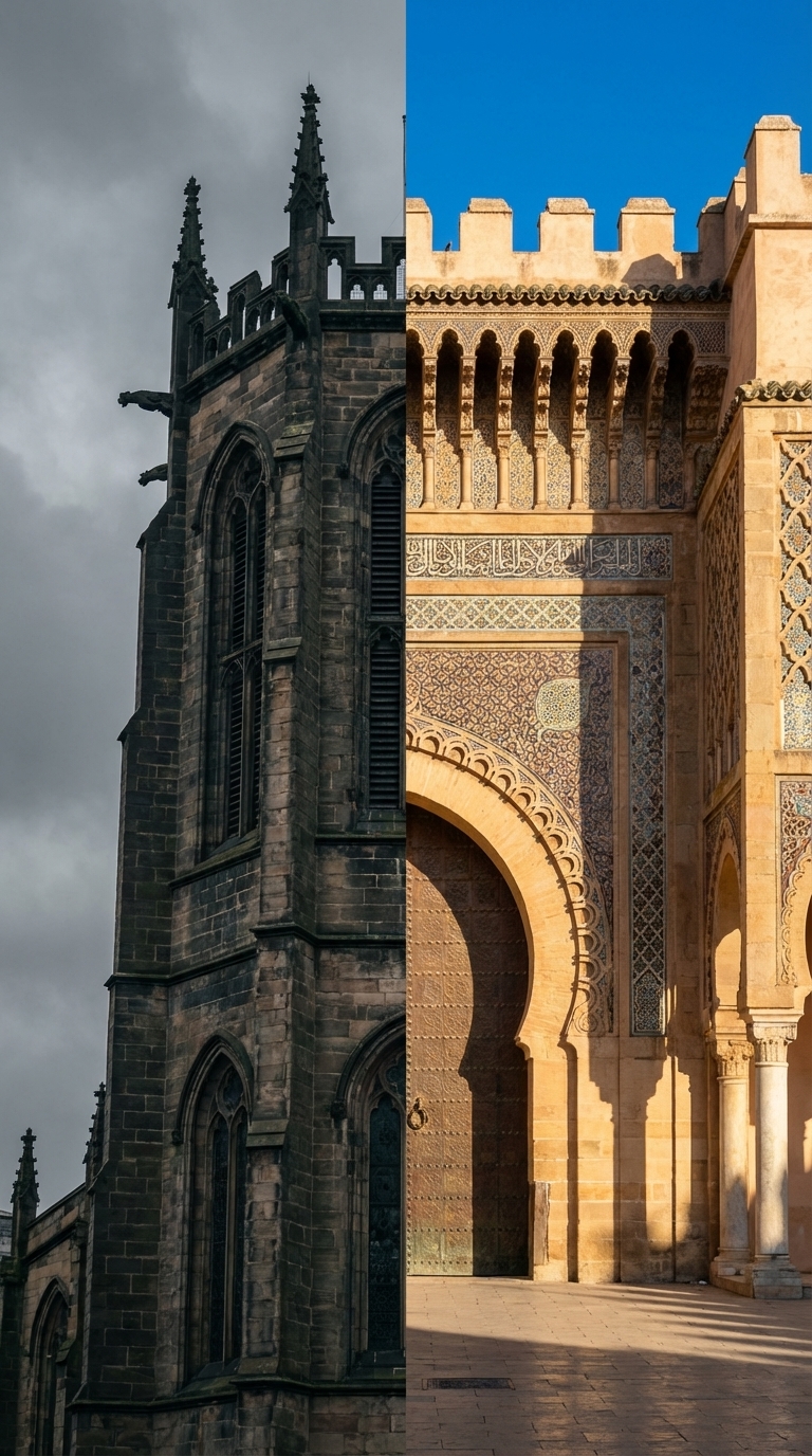 Strong rule: style --- Cinematic, hyperrealistic, 8K, photorealistic, ... ---. Динамичный кадр, разделенный на две части (split screen). Слева — готическая башня с узкими окнами на фоне серого неба. Справа — южный фасад с мавританской аркой и восточными орнаментами в солнечном свете.