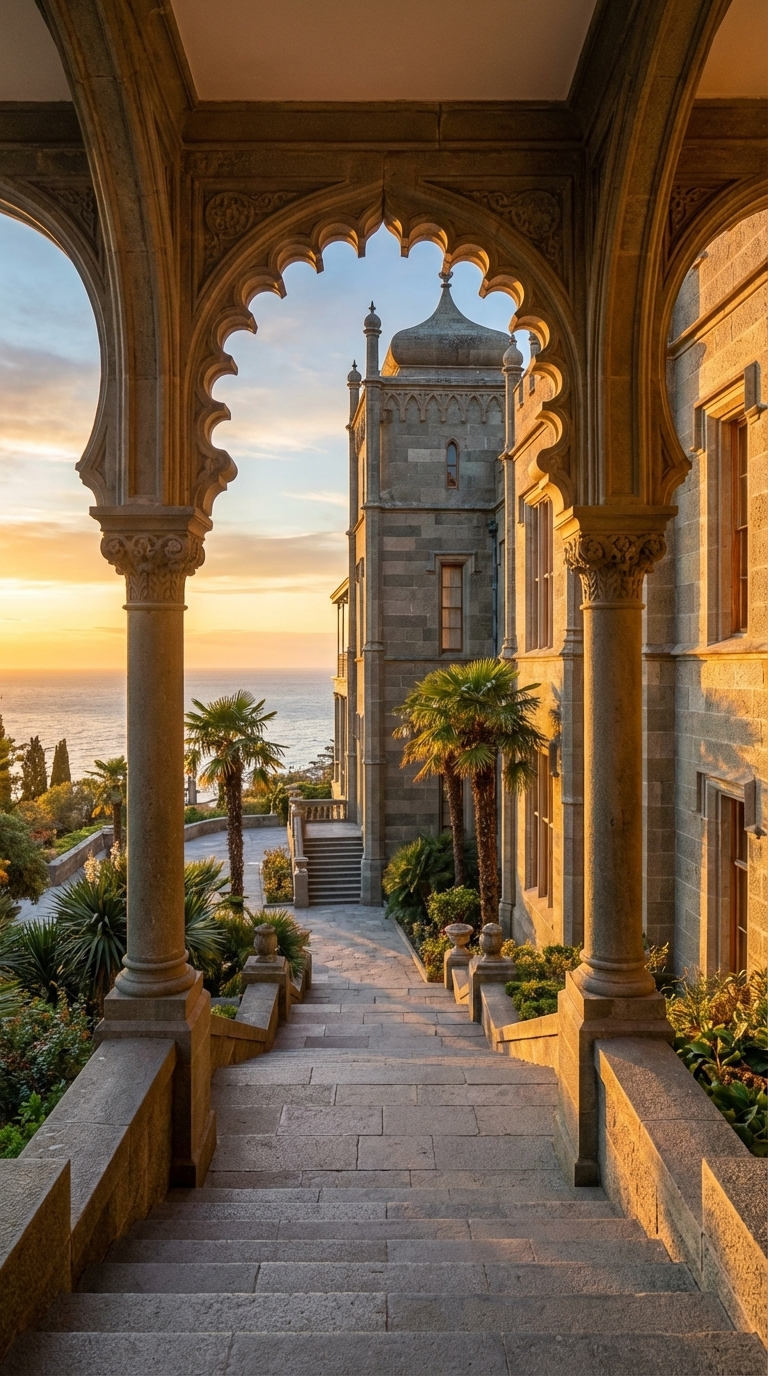 Strong rule: style --- Cinematic, hyperrealistic, 8K, photorealistic, ... ---. Создай фотореалистичный вид Воронцовского дворца в Алупке (Крым) со стороны южных террас. В кадре — мавританские арки, колонны, каменные лестницы, пальмы и вид на Чёрное море. Золотой закатный свет освещает фасад и создаёт тёплую атмосферу. Архитектура должна точно соответствовать реальному дворцу, без фантазий. Максимальная детализация, натуральные цвета, как премиальное тревел-фото, 4K. real location reference: Vorontsov Palace Alupka Crimea south terrace