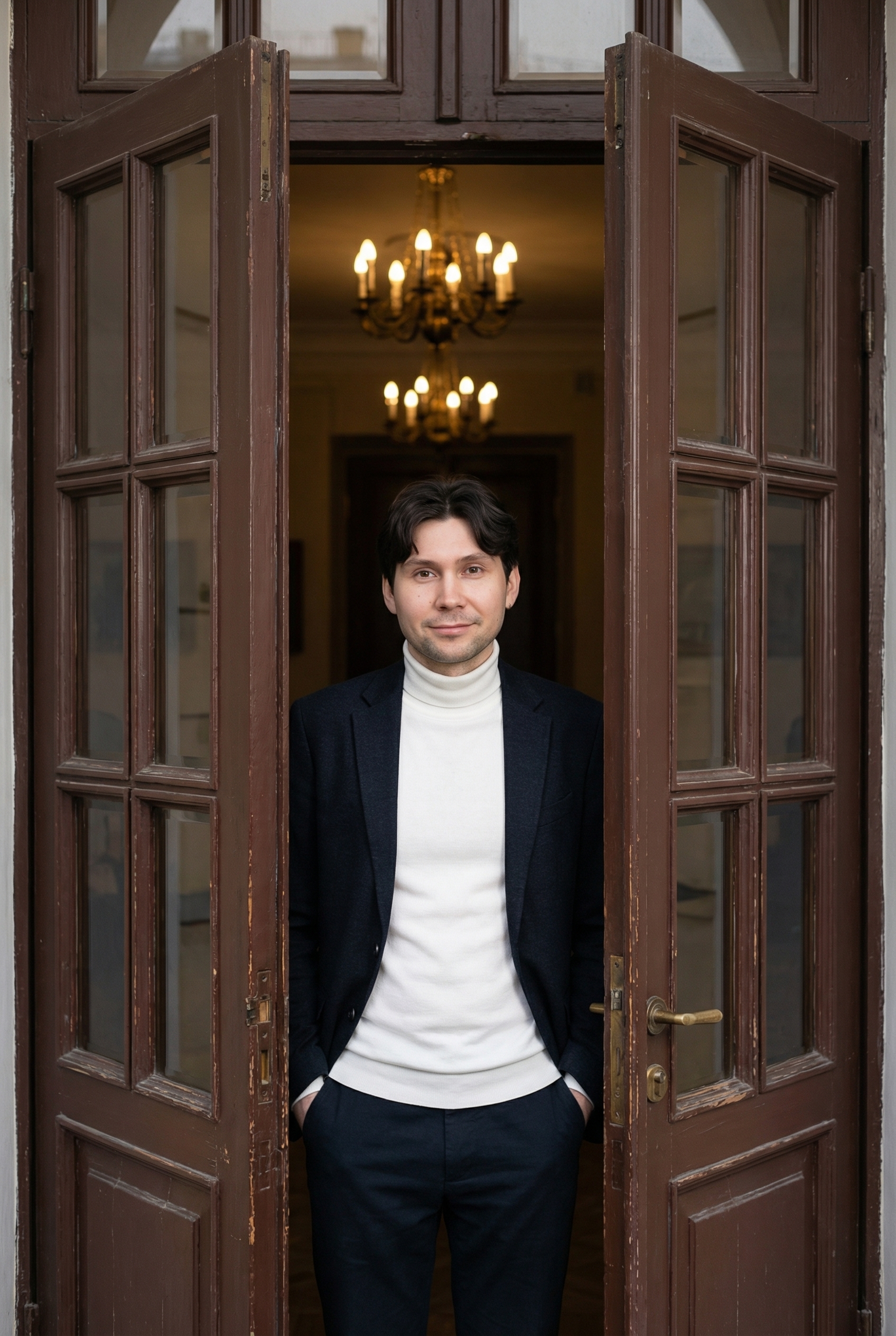 Создай реалистичное фото по моему селфи. Сохрани идентичность лица с фото и его исходное строение, а так же выражение лица и прическу. Сохрани исходную текстуру кожи и исходную асимметрию лица. Не менять лицо, не улучшать. Мужчина стоит в дверном проеме, взгляд направлен прямо в камеру. Одежда: белая водолазка (гольф), пиджак сверху, тёмные классические брюки, минималистичный стиль, монохромная гамма. Поза: стоит в открытом дверном проёме, обе руки в карманах брюк, корпус слегка наклонен вперёд, ноги вместе, расслабленная небрежная поза. Окружение: французские двери с множеством стеклянных панелей (распашные двери), благородная коричневая краска на раме, винтажная текстура дерева, видны металлические ручки. Освещение: мягкий октобокс освещает лицо, внутри помещения горят люстры. Ракурс и кадрирование: съёмка спереди на уровне глаз, средний план (видна верхняя часть тела и двери), двери занимают большую часть кадра, симметричная композиция, мужчина в центре дверного проёма. Негативный промпт изменение внешности, изменение природной асимметрии лица, face swap, изменение возраста, изменение телосложения, CGI, 3D, мультяшность, аниме, плохая анатомия, лишние пальцы, деформированные руки, wide-angle distortion, пластиковая кожа, сильная ретушь.