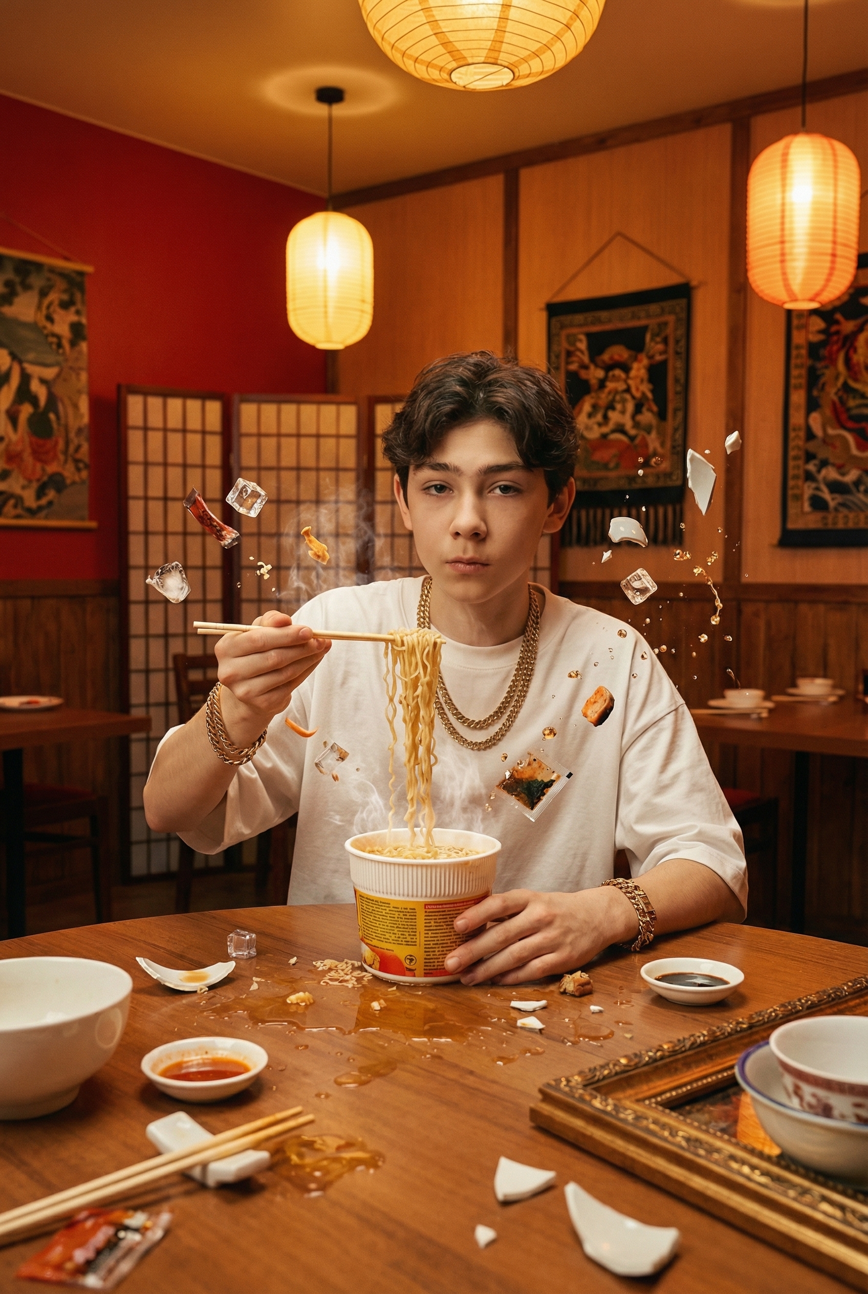 Сделай ультра-реалистичное фото по моему селфи, сохрани мою внешность строго 1-в-1. Не уменьшай глаза и не укорачивай ресницы. Без морфинга, усреднения, face swap и ретуши, сохранить текстуру кожи. Крупный кадр, ракурс фронтальный, камера на уровне груди или чуть ниже, с лёгким приближением к персонажу. На переднем плане мужчина в белой свободной футболке, стиль streetwear с акцентом на массивные цепи и браслеты. Сидит за круглым столом прямо перед камерой, корпус ровный, одна рука поднята и держит палочки с лапшой над стаканом, вторая рука опирается на стол. Мимика спокойная, сосредоточенная, слегка отстранённая. В центре кадра большой стакан лапши, лапша тянется вверх, вокруг в воздухе пар, кубики льда, куски еды, упаковка приправы, тарелки, осколки посуды и капли жидкости, эффект динамического зависания предметов. На столе разлитый бульон, соусница, тарелки с едой, палочки, украшение в виде фигурной рамки. Фон — интерьер азиатского ресторана с красными стенами, деревянными панелями, декоративными решётками, настенными панно и тёплыми подвесными бумажными фонарями. Освещение тёплое, cinematic, мягкое верхнее и боковое, с подчёркнутым паром и бликами на предметах. Фильтр тёплый, насыщенный, с золотисто-оранжевой цветокоррекцией и лёгким винтажно-кинематографичным контрастом. Негативный промпт: любое изменение внешности, лишние конечности, изменение строения лица, изменение природной асимметрии, любая ретушь лица , уменьшение глаз и ресниц, морщины, пластиковая кожа, изменение формы рук или пальцев, лишние пальцы, деформация кистей, пересвет, шум, логотипы, текст, водяные знаки, wide-angle искажения.