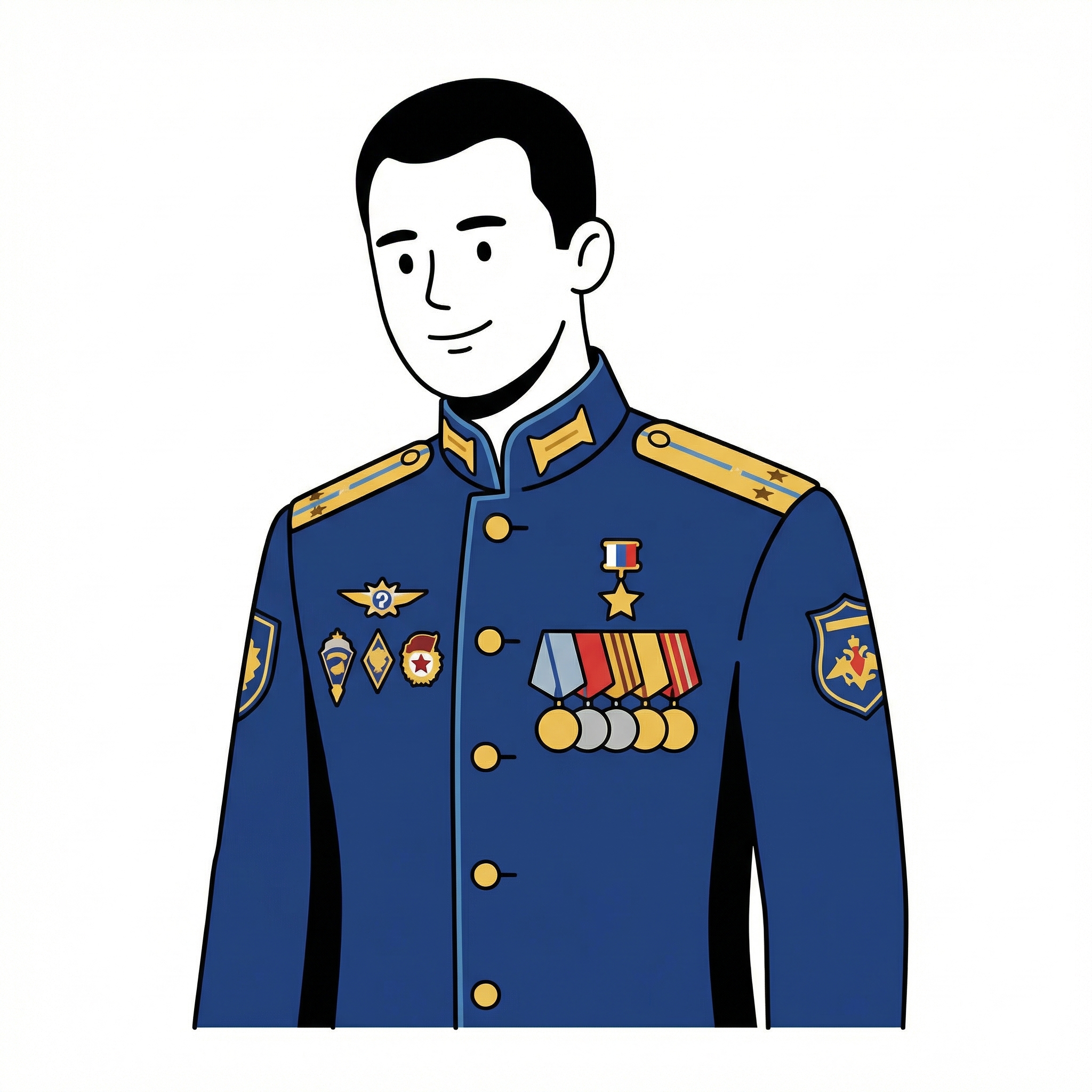 проанализируй стиль картинки как на референсе 1 создай ровно в этом же векторном стиле но в синем цвете изображение военного человека примерно как на фото референсе 2 на ровном белом фоне. стиль векторный 2Д мужчина с медалями в мундире. убери морщины