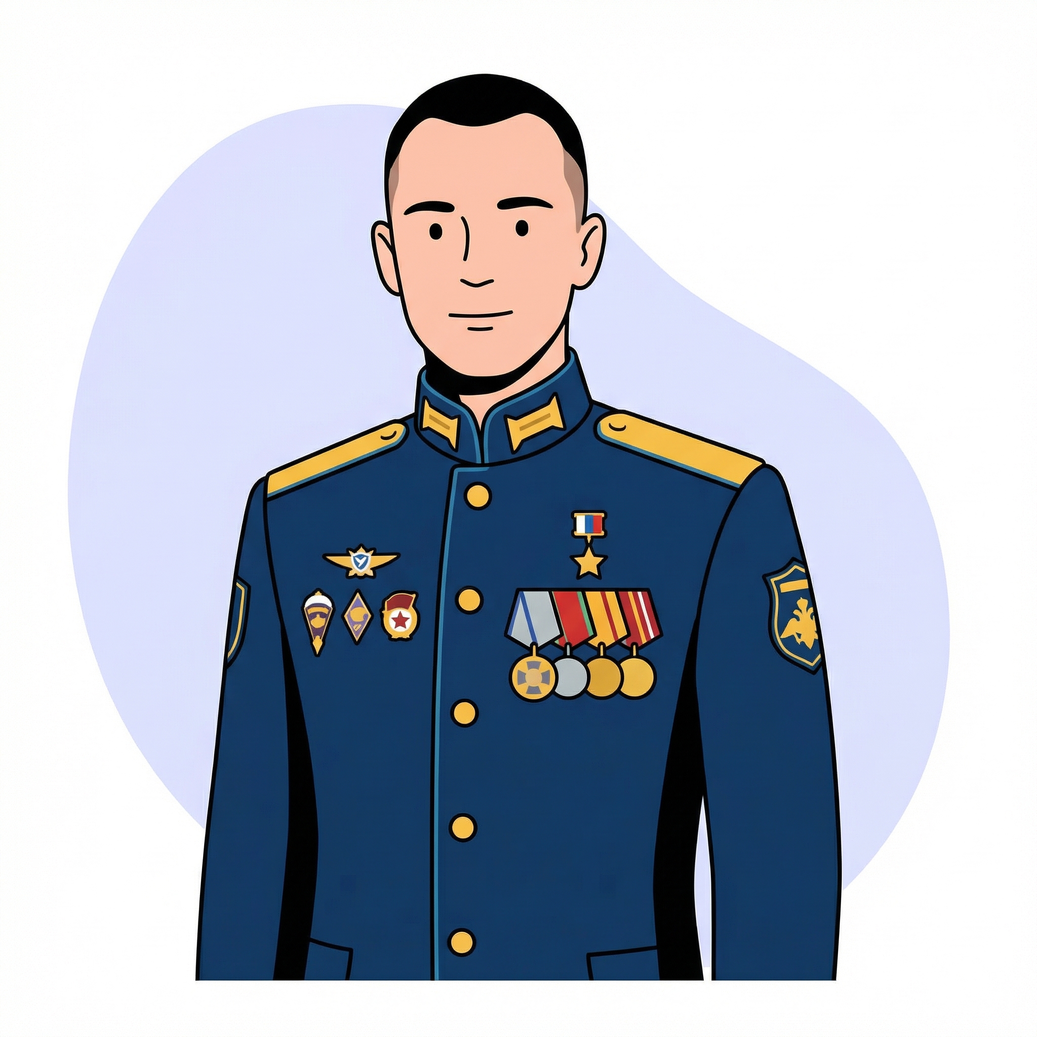 проанализируй стиль картинки как на референсе 1 создай ровно в этом же векторном стиле но в синем цвете изображение военного человека примерно как на фото референсе 2 на ровном белом фоне. стиль векторный 2Д мужчина с медалями в мундире. убери морщины. на фон добавь нежно голубую форму свободной форсы как на референсе