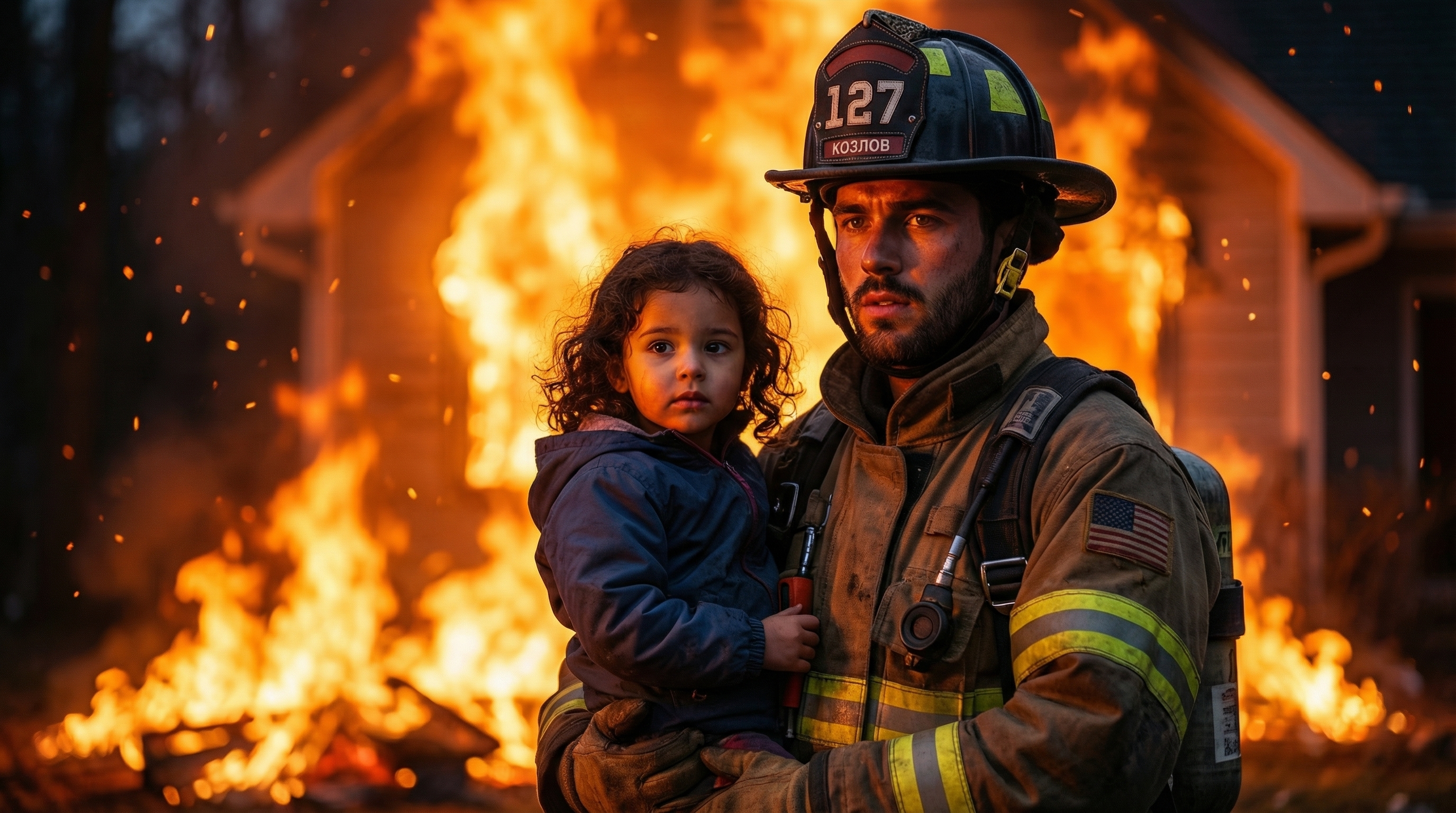 создай гиперреалистичное изображение пожарного спасающего ребенка. как на фото референсе но измени внешность пожарного и ребенка. сделай так чтобы свет больше падал на лица людей и их было видно