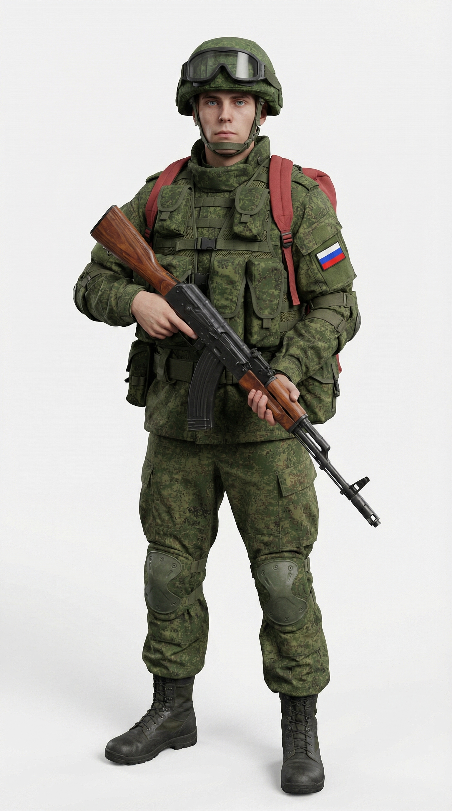 Создай гиперреалистичное изображение военного. используй референс 1 как единственный источник внешности. сходство 1:1 Без морфинга/усреднения/face swap и без ретуши. Изображение бойца в полный рост. одежда как на фото 2 и 3. на правой руке сбоку нашивка маленького русского флага (Цвета: белый, синий, красный). Боец в полный рост с автоматом а за плечами красный рюкзак. фото на белом ровном фоне. цвет формы сделай в едином оттенке зеленого и каску тоже зеленого цвета. рюкзак более минималистичный без походных ремней.