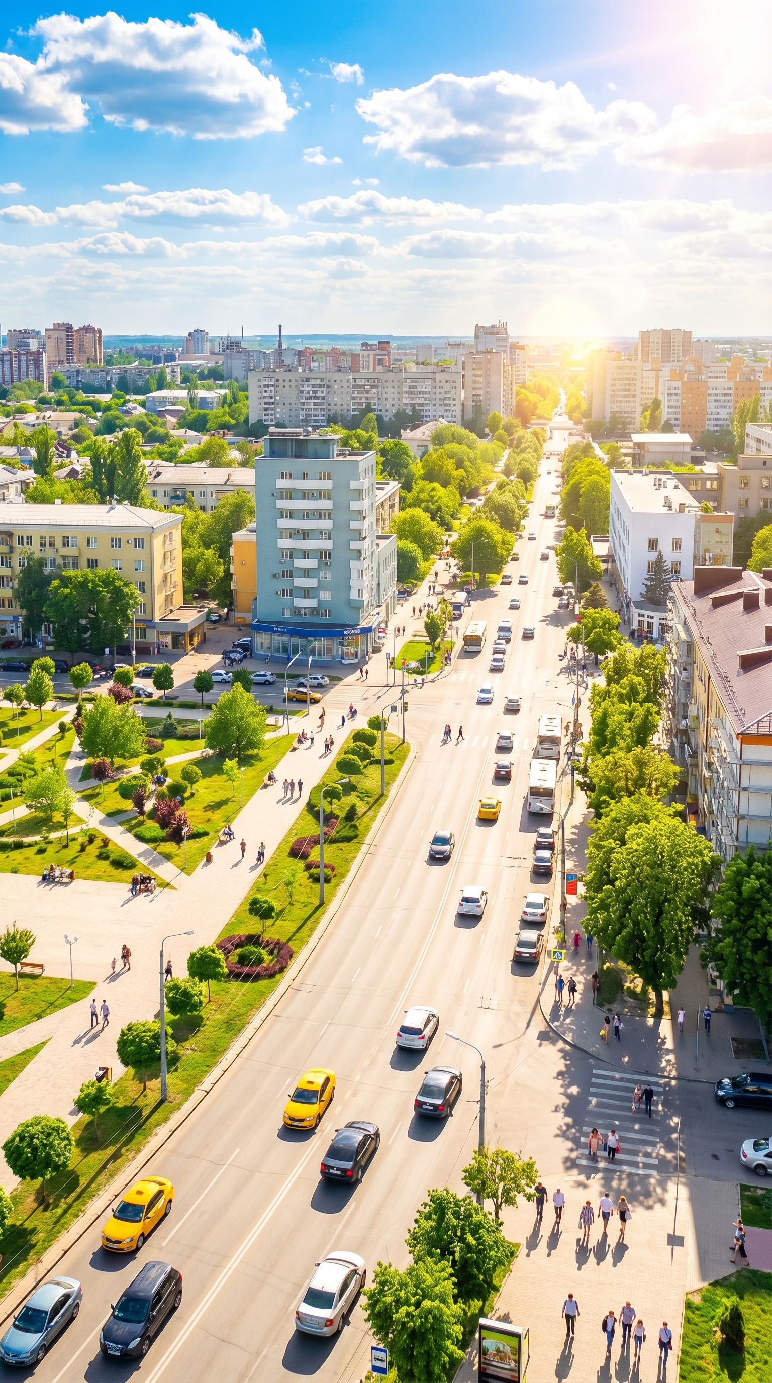 создай изображение в точности этого города добавь солнечный день блики солнца зеленые деревья и жизнерадостную атмосферу по дорогам ездят машины и кипит жизнь