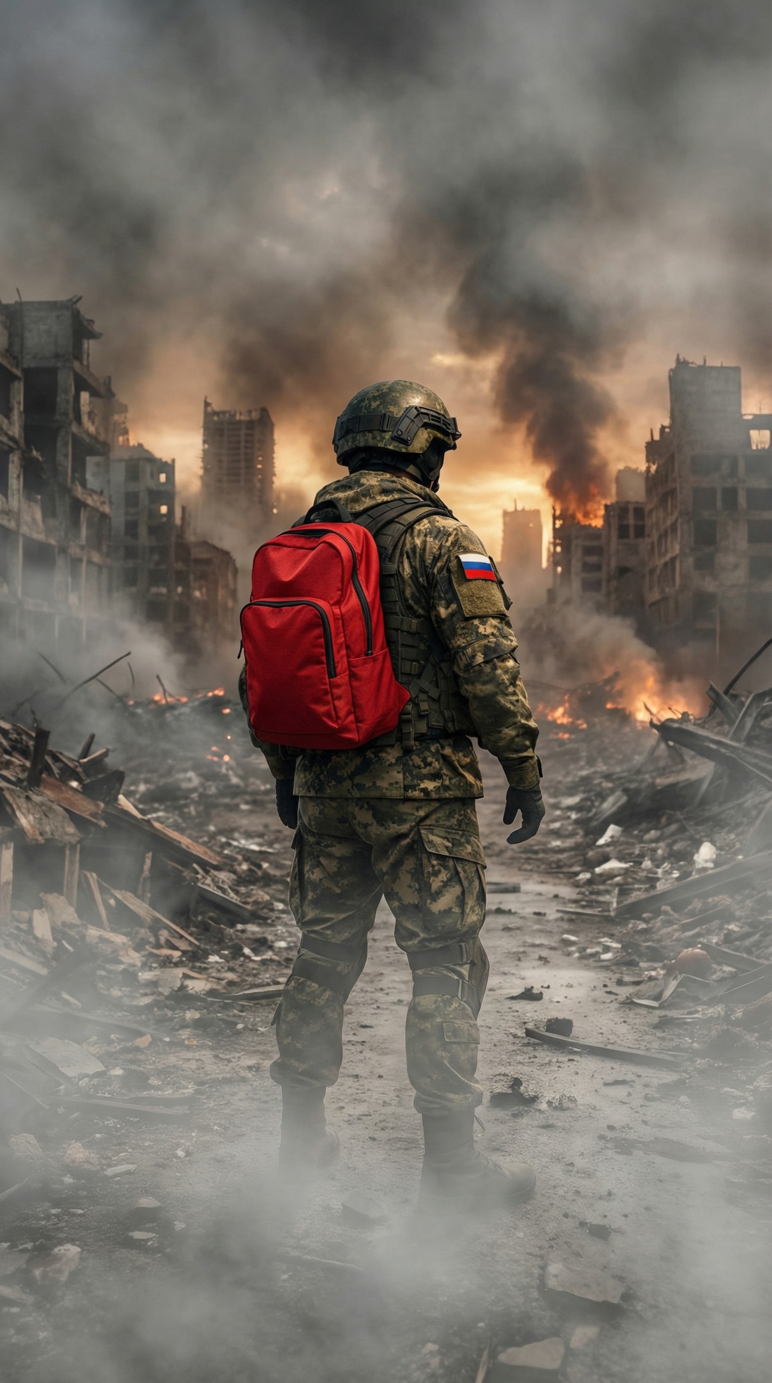 создай изображение гиперралистичное. человек вид со спины стоит в уверенной позе впереди него разрушенный выжженный город как на фото 1. сам человек в военной форме на первой руке у него маленькая нашивка российского флага (белый, синий, красный) человек одет в точности как на референсе 2. за спиной у него красный рюкзак. но рюкзак сделай более минималистичным и менее набитым без черных ремней. добавь больше руин и легкий туман сзади человека будто он восстал из пеплу. убери у человека камеру на каске и сделай ракурс немного сверху человек стоит на тропе которая ведет в даль