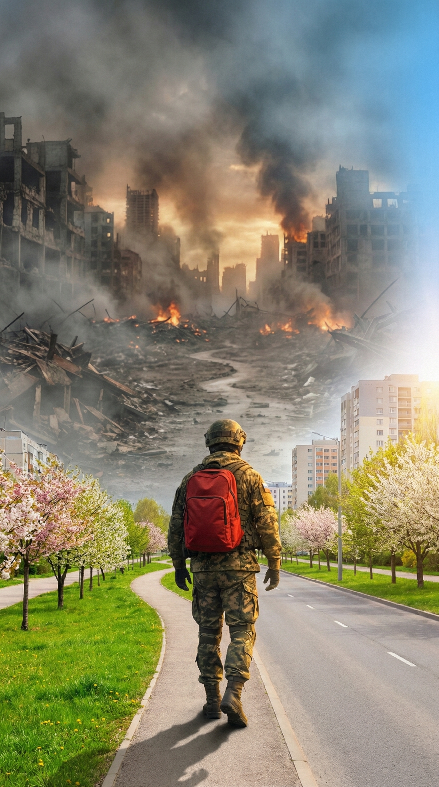 создай изображение как человек (Вид со спины) сходство 1:1 идет по тропике он уже вдали. впереди человек все еще разрушенный город как на референсе. а сзади человек уже новый солнечный город с домами и зеленью. то есть человек идет и на пройденном им пути уже новый солнечный мир. картинка должна представлять единое целое. человек стоит на границе двух реальностей. сзади него реальность мирная впереди него реальность войны и разрухи. город впереди выглядит примерно как на референсе 2 а город сзади выглядит примерно как на референсе 3