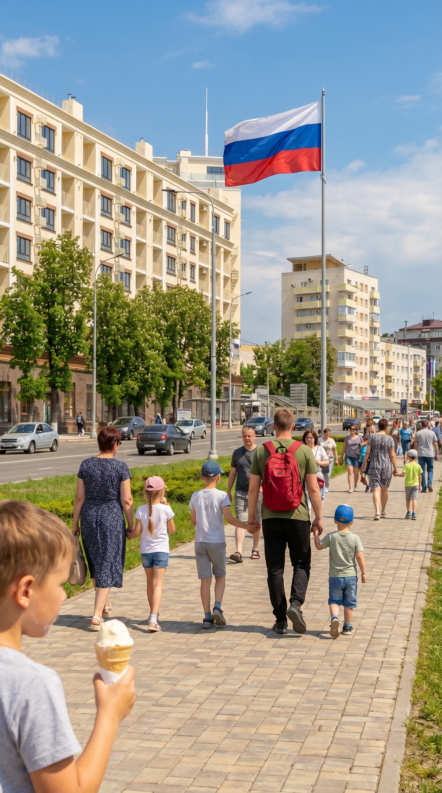 солнечный день лето по улице гуляют дети с родителями. улица и дома как на референсе 1:1. оживленная улица у ребенка в руке мороженое а вдалеке в толпе виднеется человек с красным рюкзаком как на фото 2 (сходство внешности 1:1) но человек в обычной одежде. зеленой футболке и черных штанах но с ярко красным рюкзаком человек идет рядом с маленьким мальчиком за руку они виднеются вдалеке. убери все флаги. добавь один влаг висящий на столбе. флаг России (белый, синий и красный)