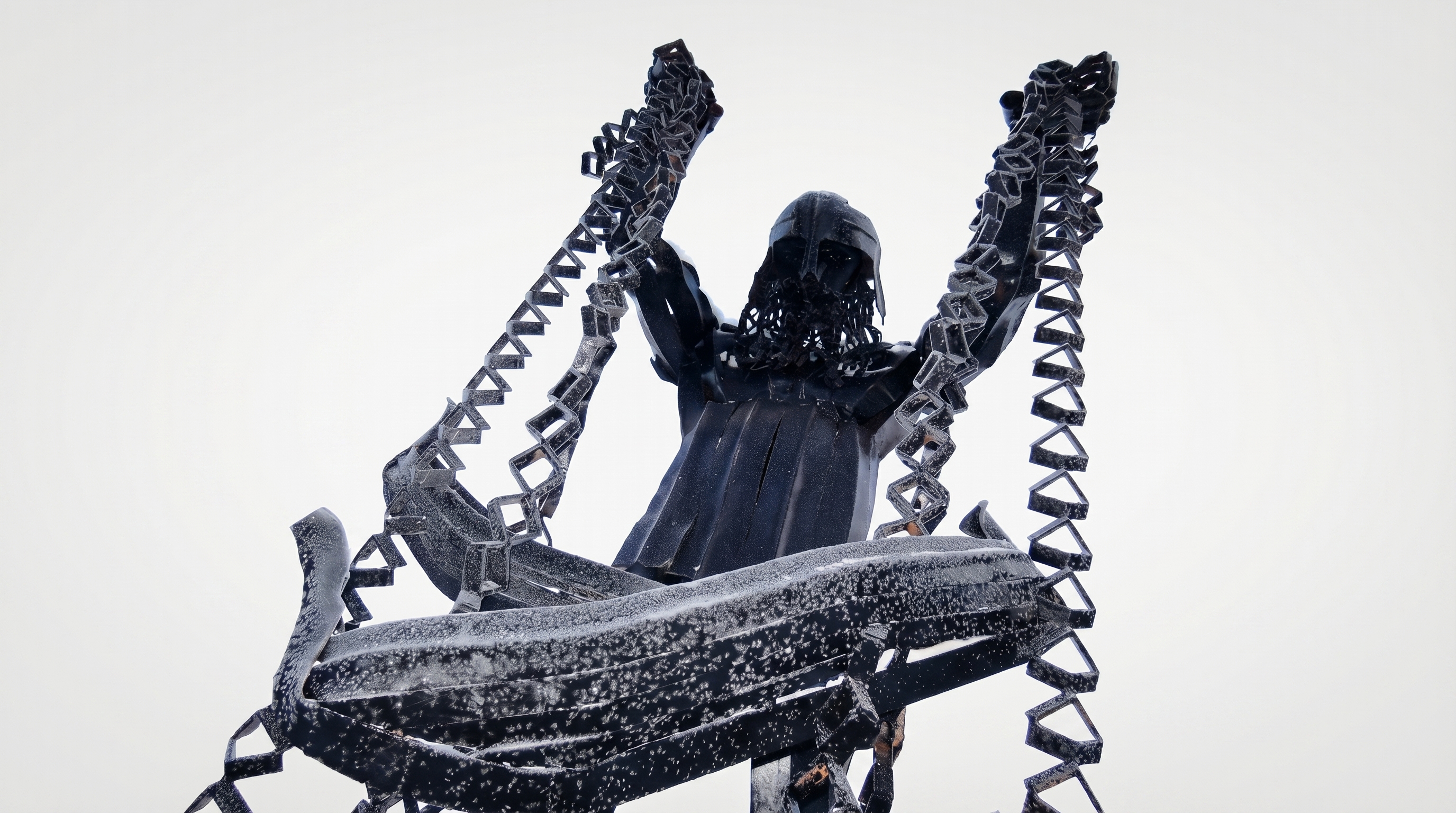 создай изображение этой железной статуи не меняя ничего. сходство 1:1 но на ровном белом фоне. повысь качество изображения. и добавь белый фон сверху чтобы появилось больше пространства