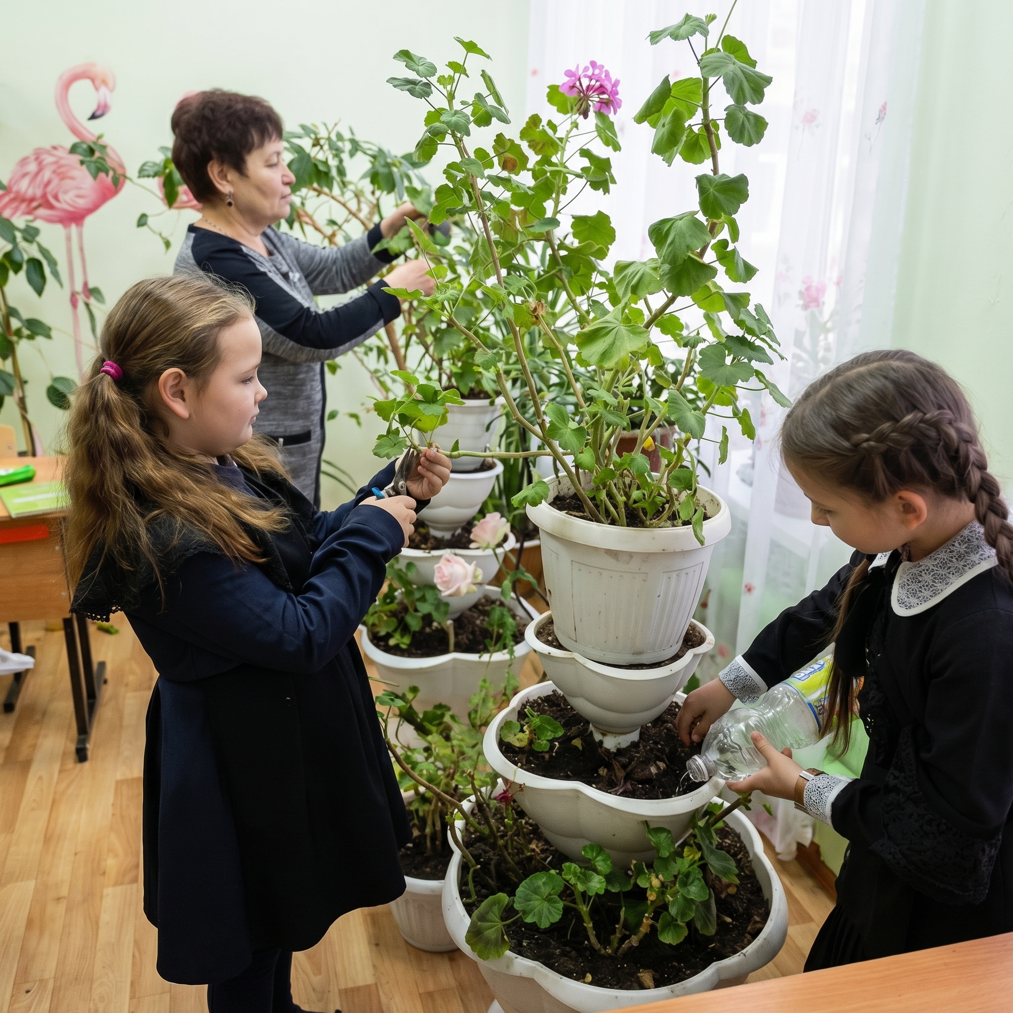 Создай изображение как дети школьники в школьной форме ухаживают за растениями в кабинете вместе с учительницей. гиперреалистичное изображение. примерно как на фото референсе. но фото как при профессиональной съемке лучше поставлен кадр и свет устроен как профессиональный.
