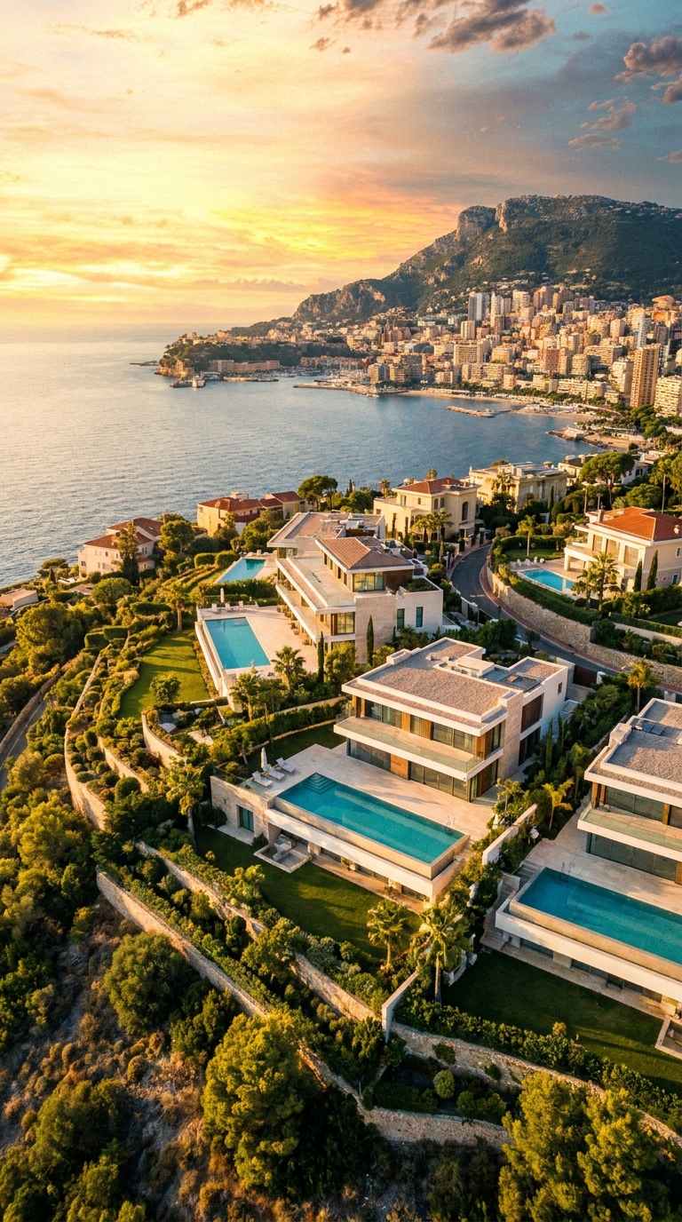 Strong rule: style --- Кинематографичный, реалистичный ---. Вид с высоты на роскошный жилой комплекс, расположенный на холме. На заднем плане раскинулись море, горы и город. Съемка в золотой час, что придает изображению теплые, мягкие тона. Реалистичный, люксовый стиль.