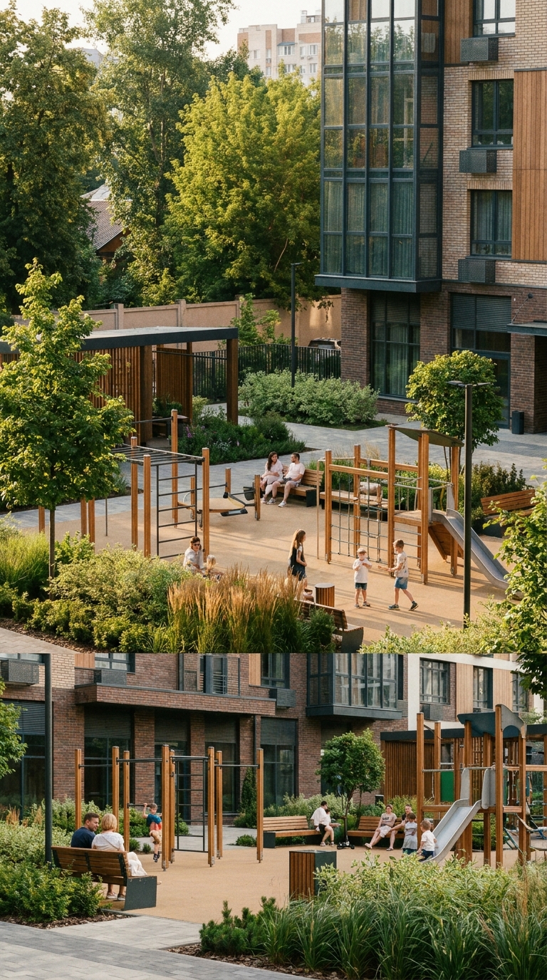 Strong rule: style --- Кинематографичный, реалистичный ---. Современный и чистый двор жилого комплекса с закрытой территорией. В кадре видны стильная детская площадка, зона для занятий спортом, удобные лавочки и красивый зеленый ландшафт. Дневной свет.