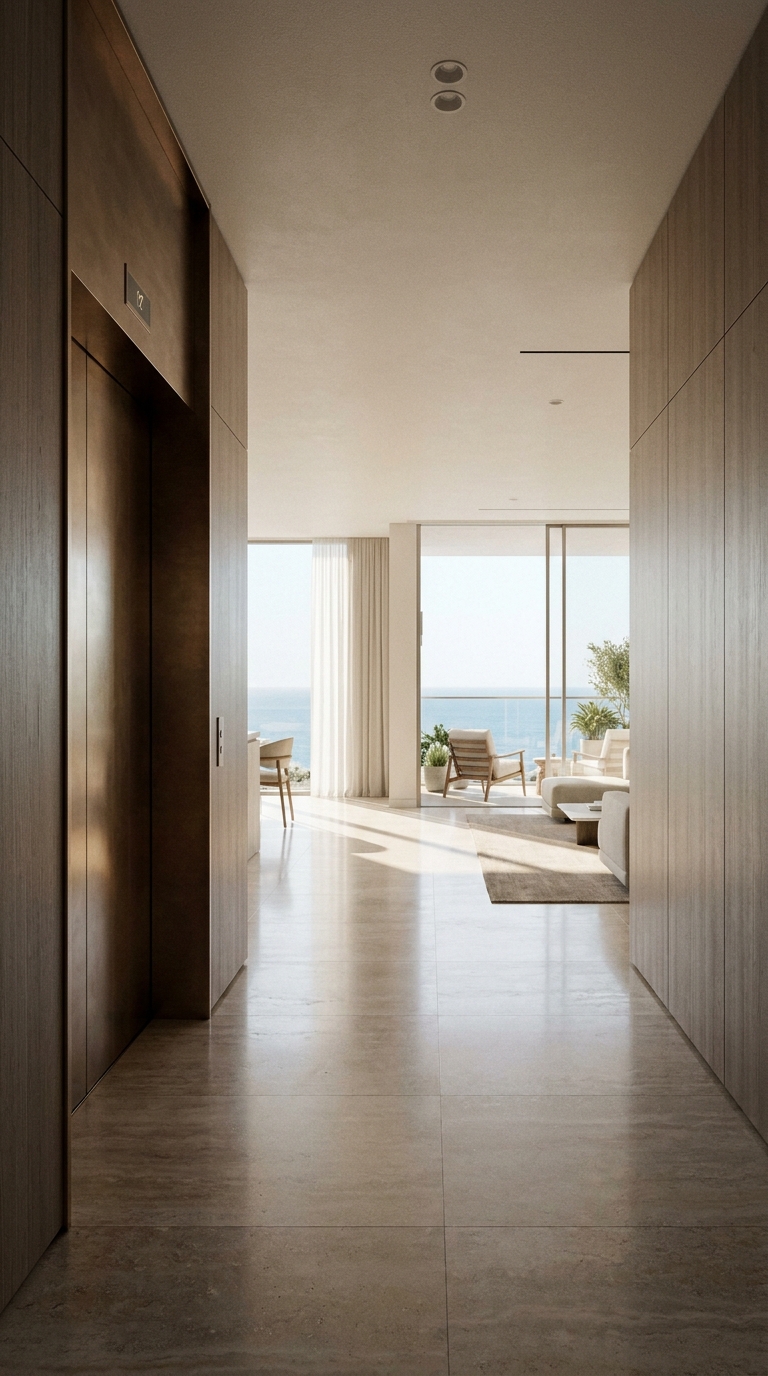 Strong rule: style --- Кинематографичный, реалистичный ---. Интерьер подъезда премиум-класса, двери бесшумного лифта. Плавный переход в светлую, современную квартиру с панорамными окнами и уютным балконом с видом на море. Стиль — уютный минимализм, мягкий естественный свет.