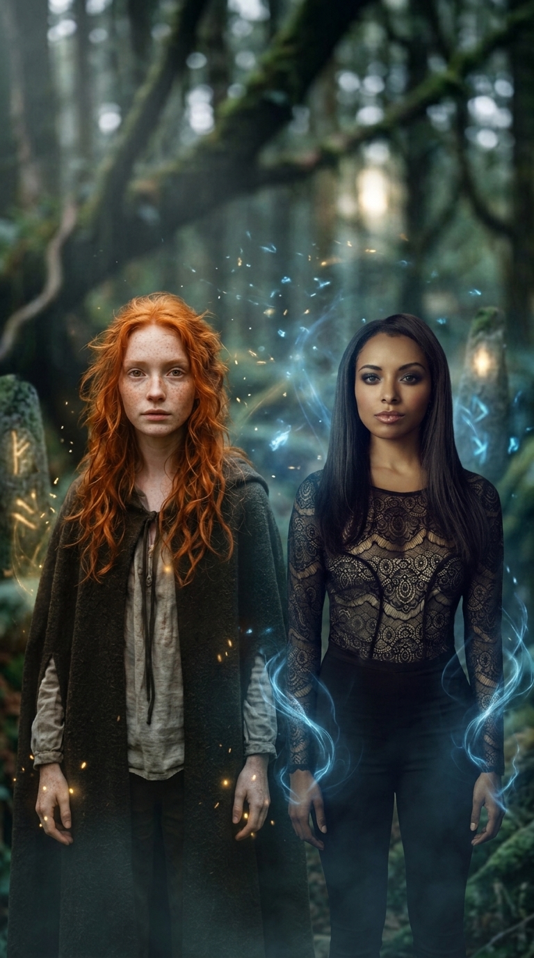 Strong rule: style --- Cinematic Realistic ---. Две версии Бонни Беннет смотрят прямо в камеру, статичный кадр. Слева: Бонни из книги (кудрявые рыжие волосы, полупрозрачная бледная кожа). Справа: Бонни из сериала. Кинематографичная атмосфера, магическое свечение. Character appearance reference (MUST match exactly): - Книжная Бонни: Молодая женщина лет двадцати с овальным лицом и бледной кожей, густо покрытой веснушками. У неё длинные, пышные, ярко-рыжие волнистые волосы, лежащие в художественном беспорядке. Глаза теплого янтарного цвета с проницательным взглядом. Телосложение стройное и хрупкое. Она одета в тяжелый темно-коричневый шерстяной плащ с капюшоном и светлую льняную рубаху на завязках. Выражение лица спокойное, задумчивое и серьезное, поза — прямой фронтальный портрет. - Сериальная Бонни: Молодая женщина лет двадцати с кожей теплого карамельного оттенка и изящным сердцевидным лицом. У неё длинные, идеально прямые тёмно-каштановые волосы, разделенные на прямой пробор. Выразительные зелено-карие глаза подчеркнуты глубоким дымчатым макияжем, дополняющим высокие скулы и полные губы. Она обладает стройным телосложением и одета в облегающий топ из сложного черного кружева с цветочными узорами поверх подкладки телесного цвета. Её взгляд прямой и серьезный, выражающий спокойную уверенность и легкую таинственность в статичной фронтальной позе.