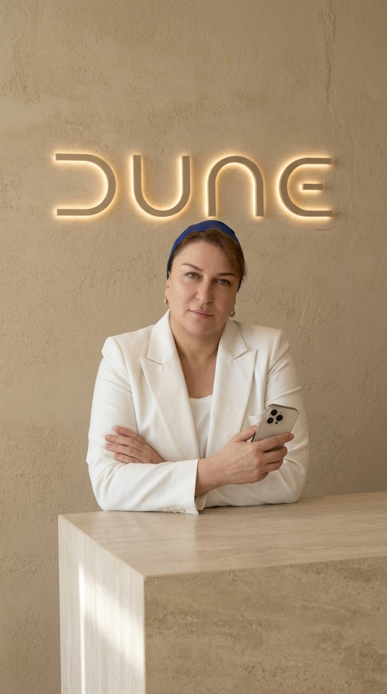 Strong rule: style --- Realistic Photography ---. Гиперреалистичный статичный кадр. Профессиональный риелтор-женщина за минималистичным столом из цельного камня. Стена с песочной текстурой и светящейся вывеской "DUNE" на заднем плане. В свободной руке она держит телефон, выглядит собранной и уверенной. Монохромная бежевая палитра. Character appearance reference (MUST match exactly): - Риелтор: Зрелая женщина около 50 лет с овальным лицом и светлой гладкой кожей. У нее рыжевато-каштановые волосы, аккуратно убранные назад с помощью широкого синего ободка. Глаза зеленовато-карего цвета под четко очерченными бровями. Она среднего телосложения, одета в строгий белый пиджак поверх белого топа. Из аксессуаров видны небольшие золотые серьги. Женщина сидит, скрестив руки на груди, с серьезным, вдумчивым и слегка властным выражением лица.
