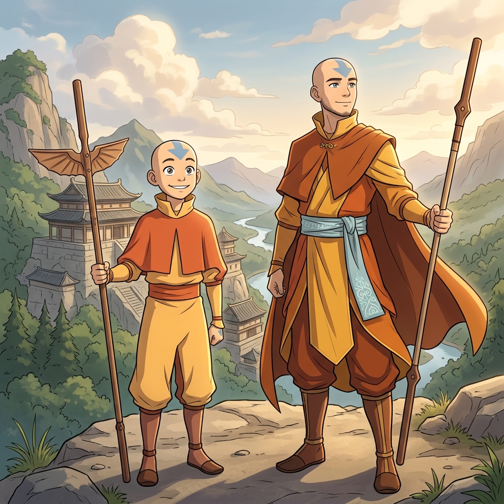 Strong rule: style --- Modern cinematic 2D anime aesthetic, soft bloom... ---. Young 12-year-old bald monk with arrow tattoos, and his 25-year-old self: tall, athletic, beardless, wearing Airbender master robes.