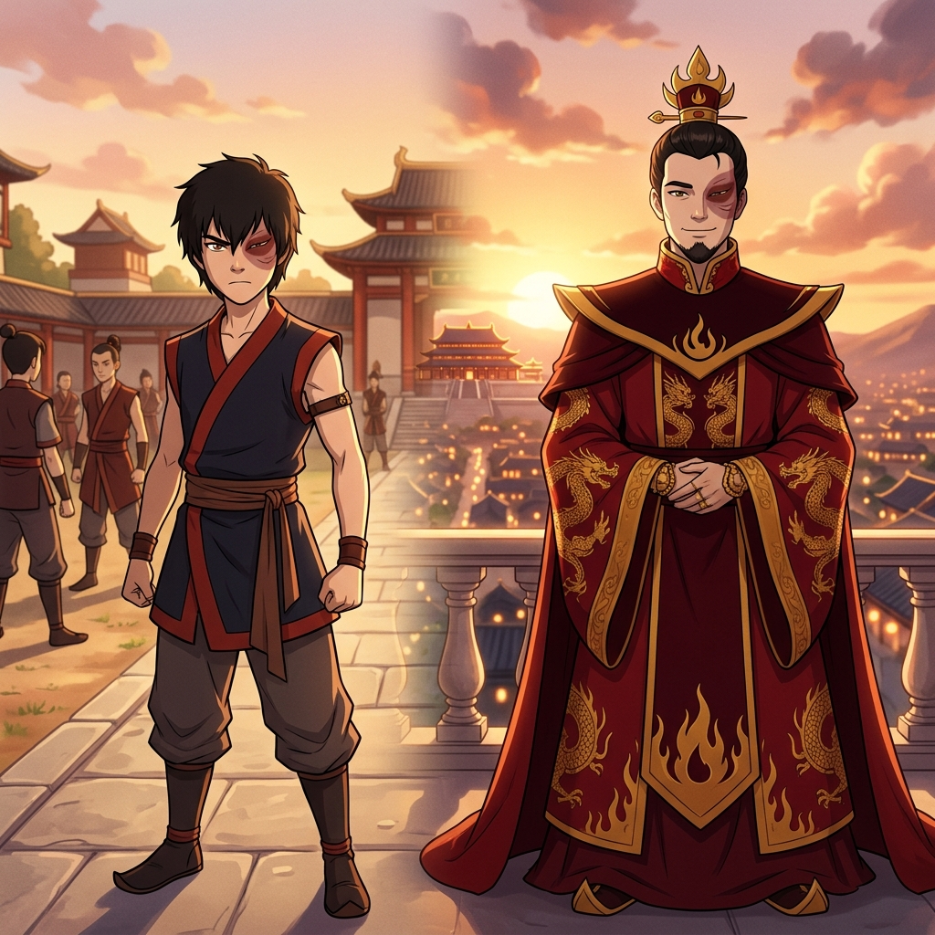 Strong rule: style --- Modern cinematic 2D anime aesthetic, soft bloom... ---. Young teen with short hair and a burn scar over his left eye, and his 25-year-old self: refined hairstyle, magnificent Fire Lord robes, regal posture, same scar but peaceful expression.