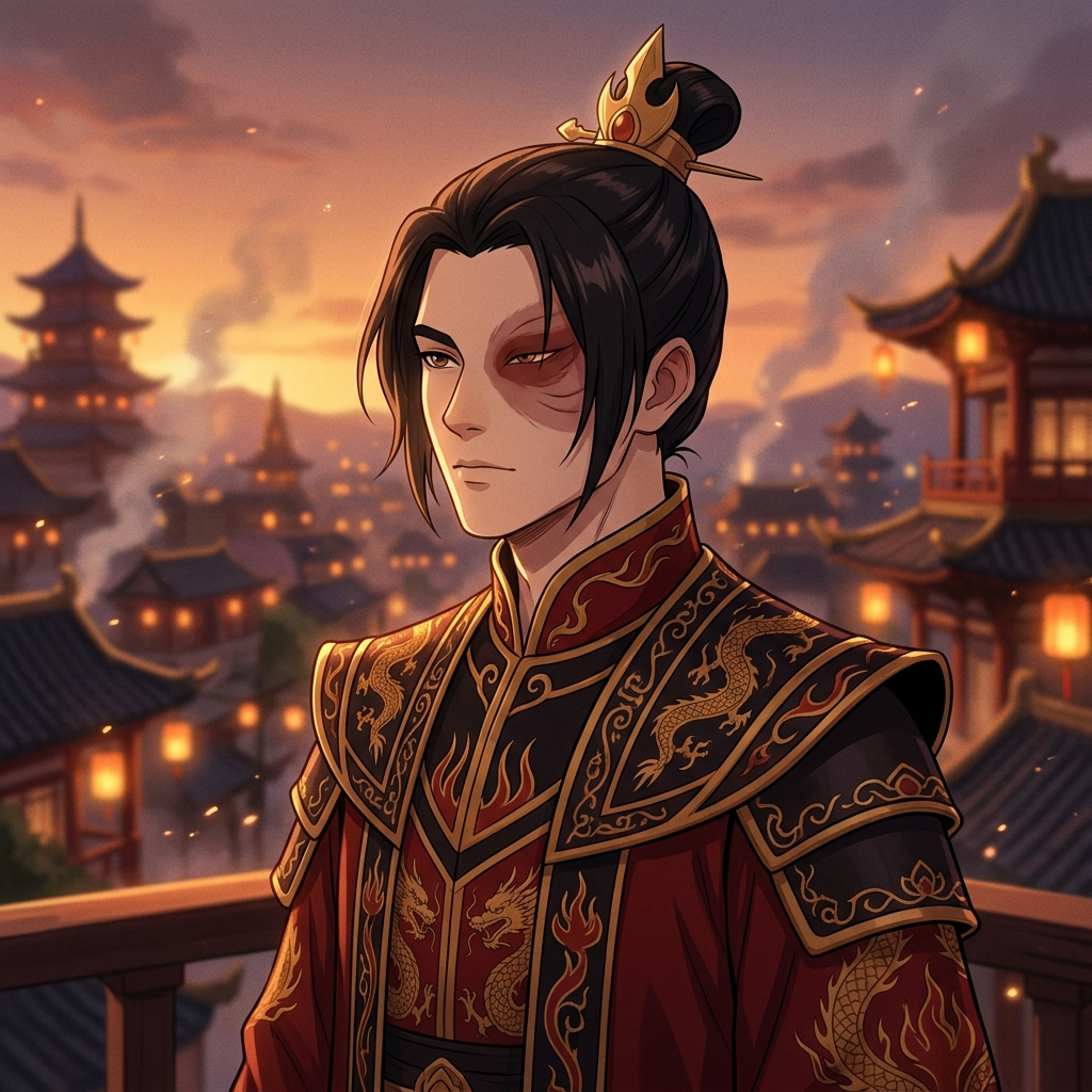 Strong rule: style --- Modern cinematic 2D anime aesthetic, soft focus... ---. 25 years old, the Fire Lord. He has an elegant hairstyle and wears magnificent Fire Lord robes. His scar remains, but his expression is calm, noble, and regal.