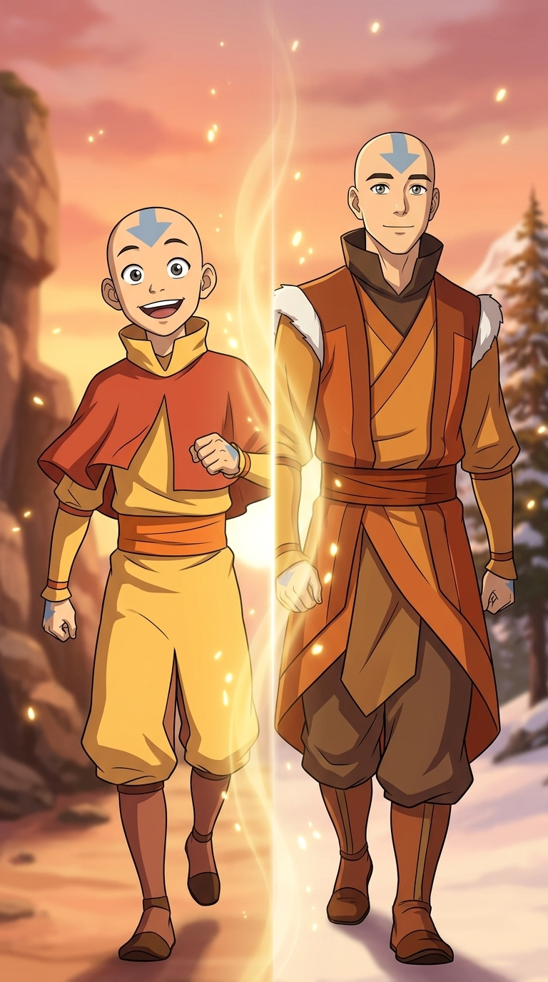 Strong rule: style --- Modern cinematic 2D anime aesthetic, soft focus... ---. A split-screen composition. On the left, Young Aang (12, bald) walks forward with a playful smile. On the right, Adult Aang (25, master's robes) walks in perfect sync, his expression serene and wise. A soft, radiant golden aura connects them, with glowing sparks floating in the air against a warm sunset background. Character appearance reference (MUST match exactly): - Юный Аанг: Двенадцатилетний мальчик с круглым лицом и светлой кожей, полностью лысый с характерной светло-голубой татуировкой в виде стрелки на лбу. У него большие выразительные темные глаза и широкая жизнерадостная улыбка, обнажающая зубы. Он худощавого, атлетичного телосложения, одет в традиционную одежду Воздушных кочевников: короткую красно-оранжевую накидку с высоким воротником поверх желтой туники и широкий оранжевый пояс. Он стоит в дружелюбной позе, излучая юношескую энергию и оптимизм. - Взрослый Аанг: Молодой мужчина атлетичного телосложения с полностью выбритой головой и характерной синей татуировкой в форме стрелы, спускающейся на лоб. У него овальное лицо с теплым оттенком кожи, выразительные серые глаза и доброжелательная улыбка. Он одет в традиционное многослойное одеяние кочевников воздуха в оранжево-коричневых тонах с высоким темным воротником и белой меховой оторочкой на плечах. Его взгляд излучает спокойствие и оптимизм, а поза открытая и уверенная.