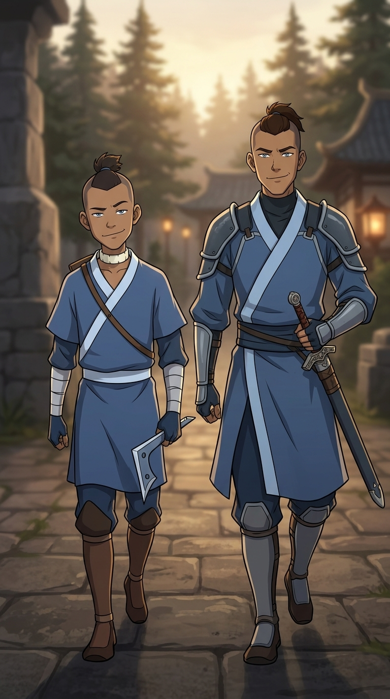 Strong rule: style --- Modern cinematic 2D anime aesthetic, soft focus... ---. Young Sokka walks confidently towards the camera, holding his boomerang with a determined look. Beside him, 25-year-old Sokka, a tall warrior in tactical armor, matches his step. Adult Sokka has his hand resting on his meteorite sword hilt. They both share a confident smirk. Character appearance reference (MUST match exactly): - Юный Сокка: Подросток мужского пола лет 15-16 с овальным лицом и смуглой кожей. У него темно-каштановые волосы, выбритые по бокам и собранные в высокий хвост на макушке. Глаза светло-голубого цвета, брови тонкие и выразительные. Телосложение стройное и атлетичное. Одет в синюю тунику племени Воды со светлой окантовкой и широким белым воротником-стойкой. Через плечо перекинут коричневый кожаный ремень. На лице уверенная, слегка самодовольная ухмылка с приподнятым уголком рта. Взгляд расслабленный и ироничный. - Взрослый Сокка: Молодой человек лет двадцати с загорелой кожей и овальным лицом с четкой челюстью. У него характерная прическа с выбритыми висками и темно-каштановыми волосами на макушке, уложенными в короткий хвост. Глаза яркого светло-голубого цвета, брови густые и выразительные. Телосложение стройное и атлетичное. Он одет в серо-голубое традиционное одеяние поверх темной водолазки. Выражение лица слегка обеспокоенное и задумчивое, взгляд направлен в сторону, поза естественная и расслабленная.