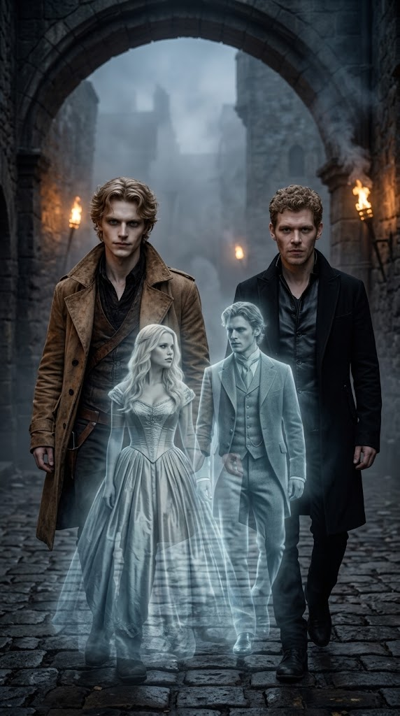 Strong rule: style --- Cinematic Dark Fantasy, realistic, high quality... ---. Two men walking forward. In front of them are two ghostly, semi-transparent figures of a beautiful blonde woman in a vintage dress and a noble man in a suit. Dark gothic street, fog. Character appearance reference (MUST match exactly): - Книжный Клаус: Молодой мужчина около 25 лет с аристократичными, резкими чертами лица, высокими скулами и бледной кожей. Его золотисто-русые волнистые волосы средней длины уложены в легком беспорядке. У него пронзительные светло-голубые глаза с интенсивным, магнетическим взглядом. Телосложение худощавое и жилистое. Он одет в фактурное, поношенное светло-коричневое пальто с широким воротником, под которым видны темная рубашка и жилет, а через грудь проходит кожаная портупея. Выражение лица сосредоточенное и таинственное, поза статичная, взгляд направлен прямо на зрителя. - Сериальный Клаус: Мужчина около 30 лет с волевым квадратным лицом, светлой кожей и пронзительными серо-голубыми глазами. У него короткие, слегка вьющиеся светло-каштановые волосы, уложенные в небрежную прическу, и легкая щетина. Телосложение стройное и атлетичное. Он одет в длинное черное шерстяное пальто поверх черного кожаного жилета на пуговицах и темные брюки. Выражение лица серьезное, сосредоточенное и угрожающее, поза уверенная, взгляд направлен прямо вперед. - Ребекка Майклсон: Молодая женщина около 20 лет с овальным лицом и безупречной светлой кожей. У нее длинные, волнистые медово-светлые волосы, уложенные мягкими волнами с пробором посередине. Глаза глубокого серо-голубого цвета под четко очерченными бровями, взгляд серьезный и пронзительный. У нее стройное телосложение, высокие скулы и аккуратные полные губы. Она одета в стильную черную куртку поверх темного топа, на шее видна тонкая серебряная цепочка. Поза статичная, голова слегка наклонена вбок, выражение лица задумчивое, с оттенком меланхолии и решительности.