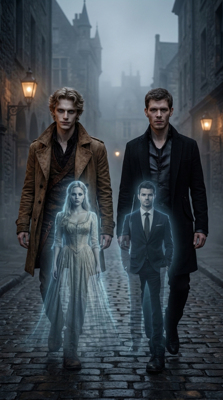 Strong rule: style --- Cinematic Dark Fantasy, realistic, high quality... ---. Two men walking forward. In front of them are two ghostly, semi-transparent figures of a beautiful blonde woman in a vintage dress and a noble man in a suit. Dark gothic street, fog. Character appearance reference (MUST match exactly): - Книжный Клаус: Молодой мужчина около 25 лет с аристократичными, резкими чертами лица, высокими скулами и бледной кожей. Его золотисто-русые волнистые волосы средней длины уложены в легком беспорядке. У него пронзительные светло-голубые глаза с интенсивным, магнетическим взглядом. Телосложение худощавое и жилистое. Он одет в фактурное, поношенное светло-коричневое пальто с широким воротником, под которым видны темная рубашка и жилет, а через грудь проходит кожаная портупея. Выражение лица сосредоточенное и таинственное, поза статичная, взгляд направлен прямо на зрителя. - Сериальный Клаус: Мужчина около 30 лет с волевым квадратным лицом, светлой кожей и пронзительными серо-голубыми глазами. У него короткие, слегка вьющиеся светло-каштановые волосы, уложенные в небрежную прическу, и легкая щетина. Телосложение стройное и атлетичное. Он одет в длинное черное шерстяное пальто поверх черного кожаного жилета на пуговицах и темные брюки. Выражение лица серьезное, сосредоточенное и угрожающее, поза уверенная, взгляд направлен прямо вперед. - Ребекка Майклсон: Молодая женщина около 20 лет с овальным лицом и безупречной светлой кожей. У нее длинные, волнистые медово-светлые волосы, уложенные мягкими волнами с пробором посередине. Глаза глубокого серо-голубого цвета под четко очерченными бровями, взгляд серьезный и пронзительный. У нее стройное телосложение, высокие скулы и аккуратные полные губы. Она одета в стильную черную куртку поверх темного топа, на шее видна тонкая серебряная цепочка. Поза статичная, голова слегка наклонена вбок, выражение лица задумчивое, с оттенком меланхолии и решительности. - Элайджа Майклсон: Мужчина около 35 лет с волевым квадратным лицом, четко очерченными скулами и легкой щетиной. У него короткие темно-каштановые волосы, аккуратно зачесанные назад, и проницательные темно-карие глаза. Он обладает атлетичным телосложением и одет в безупречный темно-синий приталенный костюм, белую классическую рубашку и темно-коричневый шелковый галстук с аккуратным нагрудным платком. Его поза уверенная, руки в карманах брюк, а выражение лица спокойное, серьезное и исполненное аристократичного достоинства.