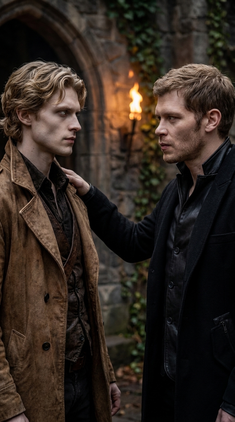 Strong rule: style --- Cinematic Dark Fantasy, realistic, high quality... ---. Medium close-up. The man on the right (modern jacket) has stepped slightly forward and placed his hand on the left man's shoulder. The left man is looking sideways at him with only his eyes, head straight. Character appearance reference (MUST match exactly): - Книжный Клаус: Молодой мужчина около 25 лет с аристократичными, резкими чертами лица, высокими скулами и бледной кожей. Его золотисто-русые волнистые волосы средней длины уложены в легком беспорядке. У него пронзительные светло-голубые глаза с интенсивным, магнетическим взглядом. Телосложение худощавое и жилистое. Он одет в фактурное, поношенное светло-коричневое пальто с широким воротником, под которым видны темная рубашка и жилет, а через грудь проходит кожаная портупея. Выражение лица сосредоточенное и таинственное, поза статичная, взгляд направлен прямо на зрителя. - Сериальный Клаус: Мужчина около 30 лет с волевым квадратным лицом, светлой кожей и пронзительными серо-голубыми глазами. У него короткие, слегка вьющиеся светло-каштановые волосы, уложенные в небрежную прическу, и легкая щетина. Телосложение стройное и атлетичное. Он одет в длинное черное шерстяное пальто поверх черного кожаного жилета на пуговицах и темные брюки. Выражение лица серьезное, сосредоточенное и угрожающее, поза уверенная, взгляд направлен прямо вперед.
