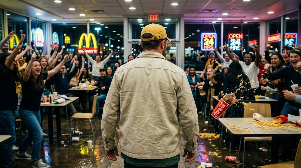 Strong rule: style --- Реалистичный кинематографичный стиль ---. Вид со спины на Тома Харди, который уверенно уходит вглубь зала Макдональдса в сторону выхода. Время мгновенно вернулось в привычное русло: на заднем плане толпа взрывается новыми криками радости, пролитая кола с шумом падает на пол, а картофель фри рассыпается по столу. Фигура Тома Харди выглядит монументально на фоне этого хаоса. Его плечи расслаблены, походка твердая. Свет от панорамных окон и ярких рекламных лайтбоксов заливает сцену спереди, создавая эффектный контурный свет вокруг его силуэта. На глянцевом полу видны четкие отражения бегущих людей и неоновых вывесок. В кадре ощущается динамика и завершенность истории. Атмосфера триумфальная, цвета насыщенные и глубокие. Камера расположена на уровне плеч, создавая эффект присутствия зрителя, который следует за героем. В воздухе все еще видны остатки брызг, которые теперь подчиняются гравитации. Финальный кадр подчеркивает контраст между спокойствием героя и безумием окружающего мира. Character appearance reference (MUST match exactly): - Том Харди: Том Харди в возрасте около 45 лет, с легкой щетиной и короткими темно-русыми волосами. На нем светлая бежевая куртка-рубашка из плотной ткани поверх темно-зеленой футболки и желтая бейсболка, надетая козырьком назад. Взгляд уверенный, спокойный и слегка ироничный. Освещение в стиле современного Макдональдса — яркое, с теплыми желтыми и красными акцентами. Фотореалистичный стиль, высокая детализация текстуры кожи, морщинок вокруг глаз и плетения ткани одежды.