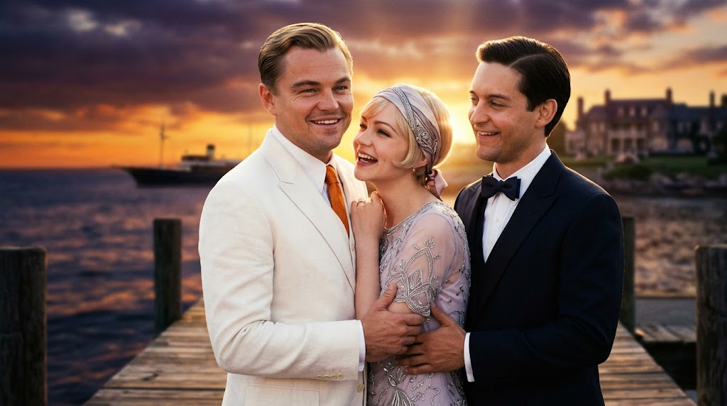Strong rule: style --- Реалистичный кинематографический стиль, эпоха 1920-х, яркие насыщенные цвета, роскошь ---. Гэтсби, Дейзи и Ник стоят в обнимку на фоне заката. Дейзи находится посередине, прижимаясь к мужчинам. Они все смеются и выглядят абсолютно счастливыми. Свет золотистый, вечерний, создающий теплую и ностальгическую атмосферу. Фон — размытый морской пейзаж. Character appearance reference (MUST match exactly): - Джей Гэтсби: Мужчина около 30 лет с короткими светлыми волосами, аккуратно зачесанными назад. У него волевое лицо, проницательные голубые глаза и легкая, уверенная улыбка. Он одет в безупречный белый льняной костюм в стиле 1920-х годов с ярким оранжевым галстуком. Освещение яркое, солнечное, подчеркивающее его статус и богатство. Фон — роскошный особняк или морской пейзаж. Стиль реалистичного кино с высокой детализацией текстур ткани и кожи. - Дейзи Бьюкенен: Молодая женщина с короткой стрижкой боб платинового цвета. У нее нежные черты лица, большие выразительные глаза и изящная фигура. Она одета в легкое, полупрозрачное платье нежно-сиреневого цвета с декоративными элементами в стиле ар-деко. На голове часто повязан стильный шелковый платок. Свет мягкий, создающий ореол вокруг нее. Фон — солнечный пляж или роскошный интерьер. Кинематографическая детализация, акцент на украшениях и фактуре платья. - Ник Каррауэй: Мужчина около 30 лет с темными волосами и вдумчивым взглядом. Лицо интеллигентное, выражение лица часто выражает удивление или любопытство. Он одет в классический темный смокинг с бабочкой или светлый летний костюм. Освещение естественное, дневное. Часто держит в руках камеру или бокал. Фон — вечеринки Гэтсби или побережье Лонг-Айленда. Реалистичный стиль, подчеркивающий его роль стороннего наблюдателя.