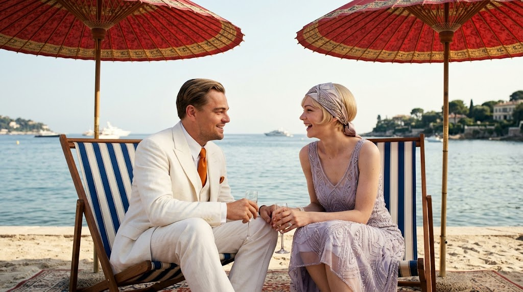 Strong rule: style --- Реалистичный кинематографический стиль, эпоха 1920-х, яркие насыщенные цвета, роскошь ---. Гэтсби и Дейзи отдыхают в полосатых шезлонгах под красными восточными зонтиками. Гэтсби в белой футболке, Дейзи в шелковом платке на голове. Они смотрят друг на друга и смеются. На фоне — спокойная гладь залива. Освещение мягкое, полуденное. Композиция симметричная, создающая уютное настроение. Character appearance reference (MUST match exactly): - Джей Гэтсби: Мужчина около 30 лет с короткими светлыми волосами, аккуратно зачесанными назад. У него волевое лицо, проницательные голубые глаза и легкая, уверенная улыбка. Он одет в безупречный белый льняной костюм в стиле 1920-х годов с ярким оранжевым галстуком. Освещение яркое, солнечное, подчеркивающее его статус и богатство. Фон — роскошный особняк или морской пейзаж. Стиль реалистичного кино с высокой детализацией текстур ткани и кожи. - Дейзи Бьюкенен: Молодая женщина с короткой стрижкой боб платинового цвета. У нее нежные черты лица, большие выразительные глаза и изящная фигура. Она одета в легкое, полупрозрачное платье нежно-сиреневого цвета с декоративными элементами в стиле ар-деко. На голове часто повязан стильный шелковый платок. Свет мягкий, создающий ореол вокруг нее. Фон — солнечный пляж или роскошный интерьер. Кинематографическая детализация, акцент на украшениях и фактуре платья.