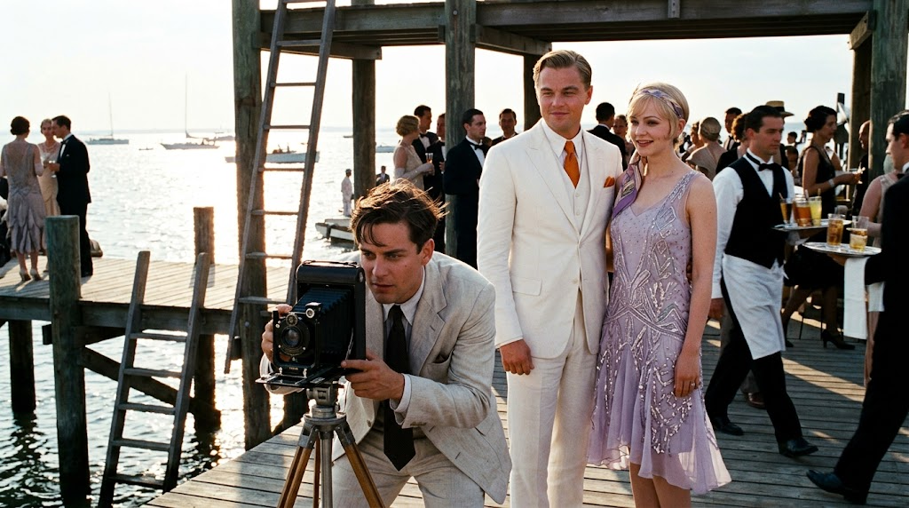 Strong rule: style --- Реалистичный кинематографический стиль, эпоха 1920-х, яркие насыщенные цвета, роскошь ---. Ник стоит на коленях на деревянном пирсе, держа в руках старинную фотокамеру. Он готовится сделать снимок. Гэтсби и Дейзи стоят рядом, позируя. Вокруг суетятся слуги и гости. Освещение яркое, контровое от воды. Композиция динамичная, с использованием вертикальных линий лестницы пирса. Character appearance reference (MUST match exactly): - Джей Гэтсби: Мужчина около 30 лет с короткими светлыми волосами, аккуратно зачесанными назад. У него волевое лицо, проницательные голубые глаза и легкая, уверенная улыбка. Он одет в безупречный белый льняной костюм в стиле 1920-х годов с ярким оранжевым галстуком. Освещение яркое, солнечное, подчеркивающее его статус и богатство. Фон — роскошный особняк или морской пейзаж. Стиль реалистичного кино с высокой детализацией текстур ткани и кожи. - Дейзи Бьюкенен: Молодая женщина с короткой стрижкой боб платинового цвета. У нее нежные черты лица, большие выразительные глаза и изящная фигура. Она одета в легкое, полупрозрачное платье нежно-сиреневого цвета с декоративными элементами в стиле ар-деко. На голове часто повязан стильный шелковый платок. Свет мягкий, создающий ореол вокруг нее. Фон — солнечный пляж или роскошный интерьер. Кинематографическая детализация, акцент на украшениях и фактуре платья. - Ник Каррауэй: Мужчина около 30 лет с темными волосами и вдумчивым взглядом. Лицо интеллигентное, выражение лица часто выражает удивление или любопытство. Он одет в классический темный смокинг с бабочкой или светлый летний костюм. Освещение естественное, дневное. Часто держит в руках камеру или бокал. Фон — вечеринки Гэтсби или побережье Лонг-Айленда. Реалистичный стиль, подчеркивающий его роль стороннего наблюдателя.