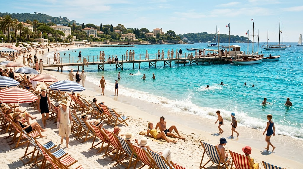 Strong rule: style --- Реалистичный кинематографический стиль, эпоха 1920-х, яркие насыщенные цвета, роскошь ---. Солнечный пляж с белым песком и лазурной водой. На заднем плане виден деревянный пирс с людьми и лодка. На переднем плане — полосатые шезлонги и зонтики. Брызги воды сверкают на солнце. Атмосфера беззаботного летнего дня. Цвета насыщенные: бирюзовый, золотистый, белый. Широкий угол обзора, захватывающий панораму побережья.
