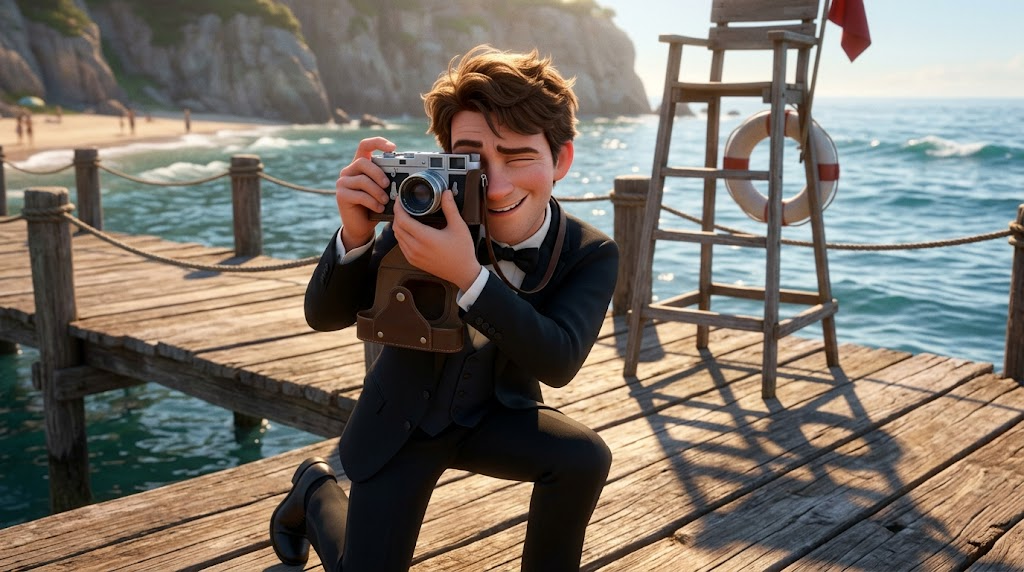 Strong rule: style --- Яркая 3D анимация в стиле Pixar ---. Ник стоит на колене на деревянном пирсе, прицеливаясь через объектив старинной фотокамеры. Он сосредоточен и улыбается. Рядом стоит лестница спасателя. Солнечный свет падает сбоку, создавая длинные тени. Высокая детализация камеры и одежды. Стиль Pixar. Character appearance reference (MUST match exactly): - Ник: Молодой человек с каштановыми волосами и добрым лицом. Одет в классический смокинг с бабочкой. В руках часто держит винтажную фотокамеру. Взгляд любопытный и искренний. Фон — роскошные интерьеры или морское побережье. Стиль Pixar.