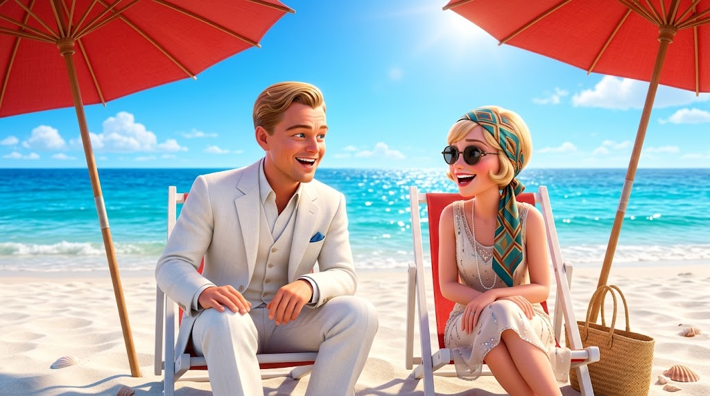 Strong rule: style --- Яркая 3D анимация в стиле Pixar ---. Гэтсби и Дейзи сидят в шезлонгах под яркими красными зонтиками на берегу моря. Они смеются и смотрят друг на друга. На Дейзи стильный платок и темные очки. Фон — бескрайний океан под ясным небом. Цвета сочные и контрастные. Анимационный стиль. Character appearance reference (MUST match exactly): - Гэтсби: Молодой мужчина с аккуратно уложенными светлыми волосами, одет в безупречный белый костюм 1920-х годов. У него выразительные голубые глаза и уверенная осанка. Освещение яркое, солнечное. Стиль 3D анимации с высокой детализацией текстур ткани и волос. - Дейзи: Красивая молодая женщина с короткими светлыми волосами, украшенными стильной повязкой. На ней изысканное платье в стиле ар-деко. Большие, светящиеся глаза и нежная улыбка. Окружена мягким, теплым светом. Стиль современной 3D анимации.
