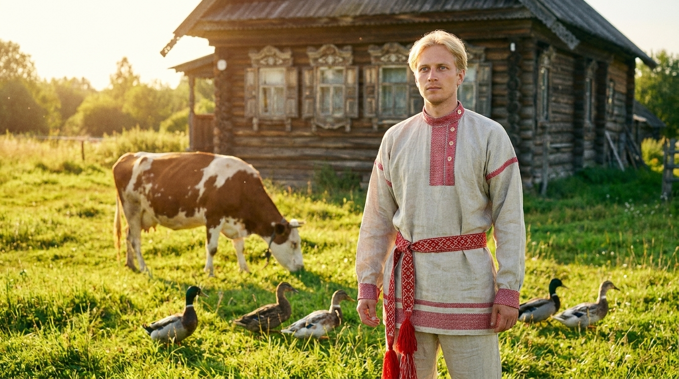 создай гиперреалистичное изображение. стиль профессиональная ретро съемка в теплых цветах. солнечная летняя погода. мужчина славянской внешности (светлые волосы, голубые глаза) стоит в зеленом поле сзади старинная русская резная изба. рядом пасется корова и ходят утки. мужчина одет в народную одежду в точности как на фото референсе 1:1.