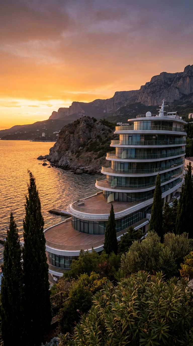 Strong rule: style --- Realistic cinematic photography ---. современный апарт-отель в форме лайнера на побережье Алушты, Крым, Черное море, горы на фоне, южная растительность, кипарисы, закат, золотой свет, премиальная архитектура, панорамные окна, ultra realistic, cinematic, luxury real estate, 9:16