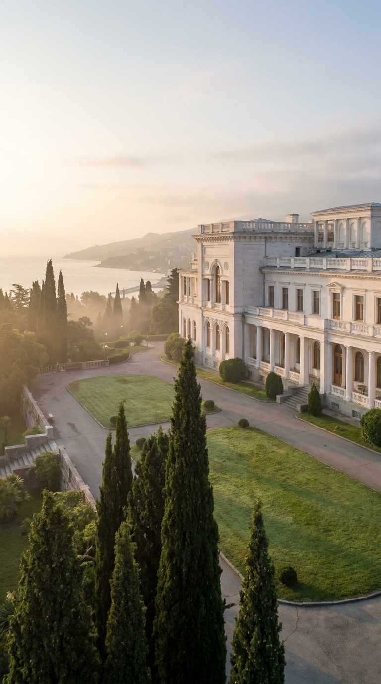 Art style: Realistic Photography. Кинематографичный общий план Ливадийского дворца в Ялте на рассвете. Белый фасад с колоннами, мягкий утренний свет, лёгкая дымка над парком, атмосфера величия и исторической тишины. ━━━━━━━━━━━━━━━━━━━━━━━━━━━━━━━━━━━━━━ FINAL STYLE ENFORCEMENT (this is the authoritative rendering directive — it overrides any style wording elsewhere in the prompt): Render this image entirely in "Realistic Photography" style. Match the lighting grammar, material response, colour science, level of realism / stylisation, line weight, and shading model typical of "Realistic Photography". Keep the subject, composition, camera angle, lighting direction, and colour palette from the description above — but EVERY surface, skin, fabric, material, and environmental element must be rendered in the "Realistic Photography" idiom, not in any other medium.