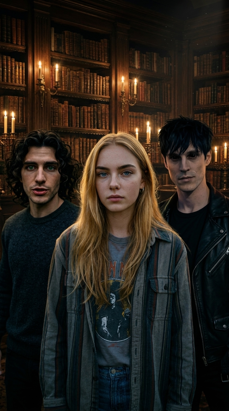 Art style: Cinematic, Dark Fantasy, Detailed Realism. Medium shot, front view. Elena (golden blonde hair, blue eyes) in the center, facing forward with a cold, resolute expression. Stefan (brown curls, green eyes) stands on the left. Damon (black hair, pitch black eyes) stands on the right. Background is an old antique library of the Salvatore mansion, lit candles, bookshelves in shadows. Cinematic lighting, highly detailed, 4k. ━━━━━━━━━━━━━━━━━━━━━━━━━━━━━━━━━━━━━━ FINAL STYLE ENFORCEMENT (this is the authoritative rendering directive — it overrides any style wording elsewhere in the prompt): Render this image entirely in "Cinematic, Dark Fantasy, Detailed Realism" style. Match the lighting grammar, material response, colour science, level of realism / stylisation, line weight, and shading model typical of "Cinematic, Dark Fantasy, Detailed Realism". Keep the subject, composition, camera angle, lighting direction, and colour palette from the description above — but EVERY surface, skin, fabric, material, and environmental element must be rendered in the "Cinematic, Dark Fantasy, Detailed Realism" idiom, not in any other medium. Character appearance reference (MUST match exactly): - Стефан: Молодой мужчина лет двадцати пяти с овальным лицом и четко очерченной челюстью. У него светлая кожа с естественной текстурой и легкая темная щетина. Волосы густые, темные, почти черные, длиной до плеч, уложены крупными небрежными кудрями. Главная особенность — неестественно яркие, пронзительные изумрудно-зеленые глаза. Телосложение стройное, атлетичное. Одет в фактурный темно-серый вязаный свитер с круглым воротом. Выражение лица напряженное и заинтригованное, губы слегка приоткрыты в момент речи. Поза — фронтальный портрет крупным планом. - Деймон: Мужчина около 30 лет с худощавым телосложением и бледной кожей. У него угловатое лицо с острыми скулами и выраженной челюстью. Волосы короткие, взъерошенные, окрашены в глубокий темно-синий цвет, густая челка спадает на лоб. Глаза темно-карие, взгляд пристальный и серьезный. Одет в черную кожаную куртку-косуху с металлическими заклепками поверх простой черной футболки. Выражение лица задумчивое и слегка меланхоличное, поза фронтальная с прямым взглядом в камеру. - Елена: Молодая женщина около 20 лет с овальным лицом и светлой кожей, покрытой мелкими веснушками. У нее длинные, прямые золотисто-русые волосы, разделенные на прямой пробор, и пронзительные голубые глаза под густыми натуральными бровями. Она стройного телосложения, одета в серую графическую футболку и полосатую плотную рубашку, в ушах — маленькие серебряные серьги-кольца. Выражение лица серьезное и пристальное, она смотрит прямо в объектив с легким оттенком меланхолии, сохраняя неподвижную позу.