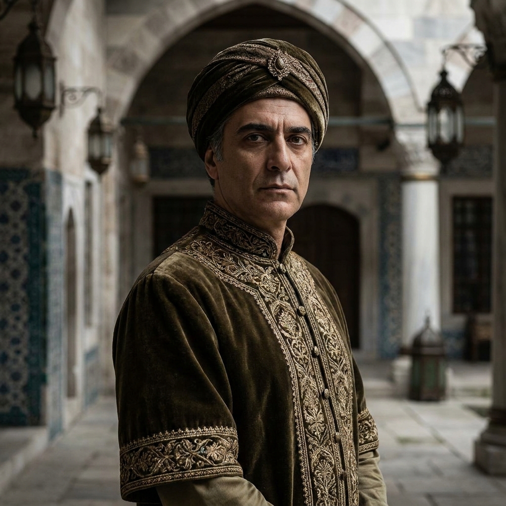 Strong rule: style --- Cinematic Ottoman Empire style, Topkapi palace,... ---. тёмные волосы, тёмные глаза, строгие черты, сдержанная мимика, прямая осанка, благородная зрелость, богатая османская одежда