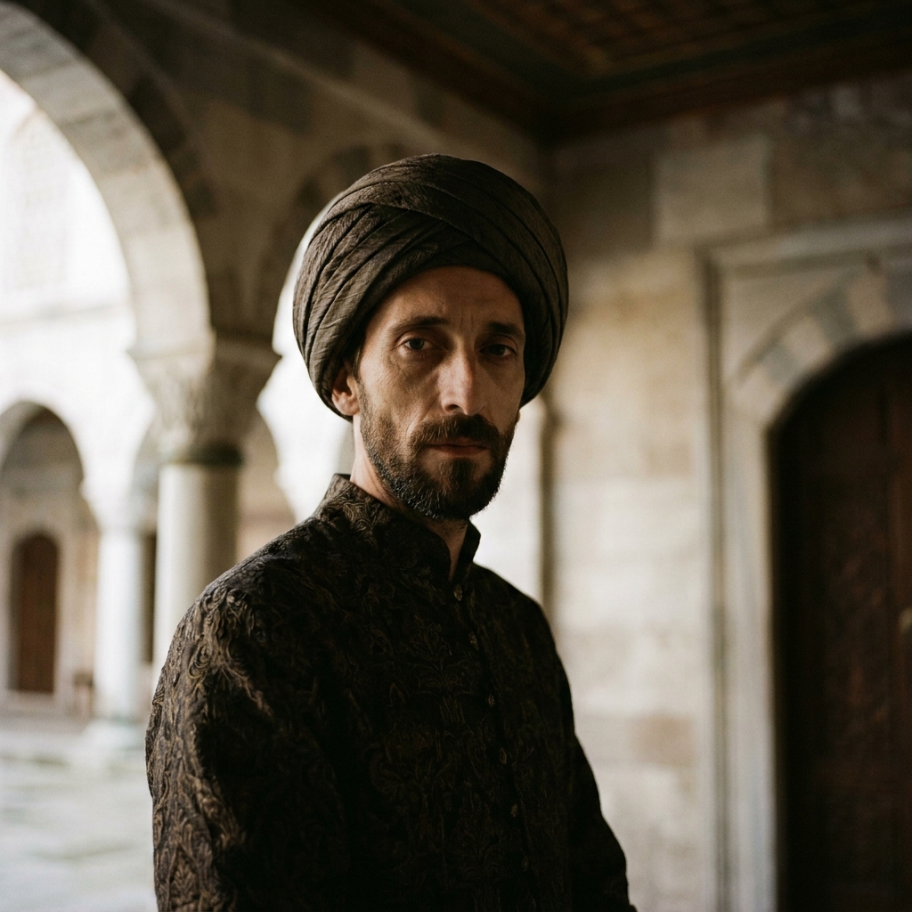 Strong rule: style --- Cinematic Ottoman Empire style, Topkapi palace,... ---. высокий, худощавый, вытянутое лицо, тёмные глаза, аккуратная борода, спокойный тяжёлый взгляд, строгий кафтан и тюрбан 16 века