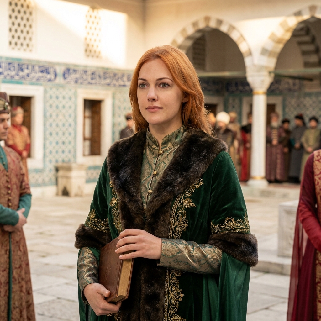 Strong rule: style --- Cinematic Ottoman Empire style, Topkapi palace,... ---. светлая кожа, натуральные рыжевато-медные волосы, светлые глаза, мягкие живые черты, спокойная уверенность, сдержанная дорогая одежда Османской империи 16 века