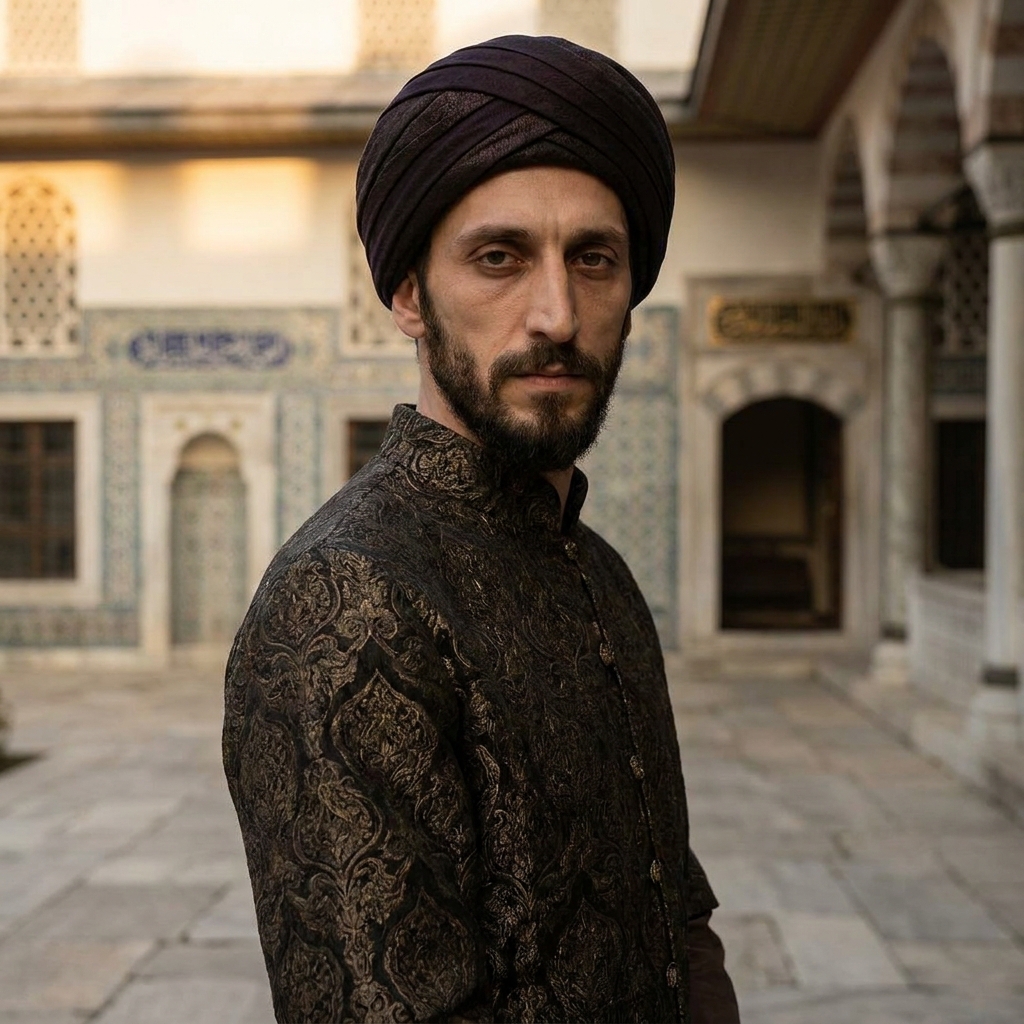 Strong rule: style --- Cinematic Ottoman Empire style, Topkapi palace,... ---. Strong rule: style --- Cinematic Ottoman Empire style, Topkapi palace,... ---. высокий, худощавый, вытянутое лицо, тёмные глаза, аккуратная борода, спокойный тяжёлый взгляд, строгий кафтан и тюрбан 16 века