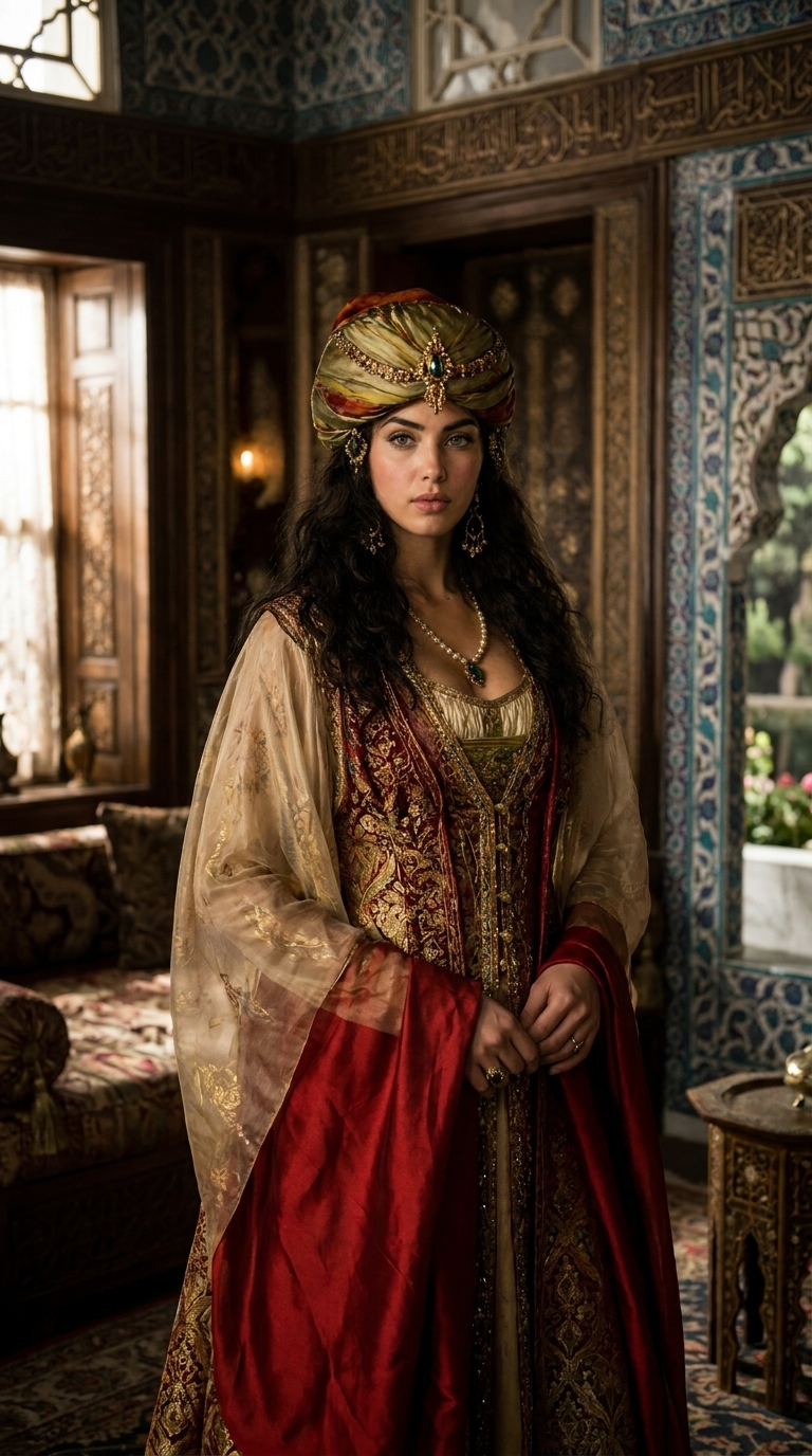 Art style: Cinematic Ottoman Empire style, Topkapi palace,.... Махидевран стоит в интерьерах дворца Топкапы. Тёмные волосы, строгие черты, благородная осанка, богатая османская одежда. Мягкий свет, глубокие тени, кинематографичный реализм. Смотрит прямо в камеру. ━━━━━━━━━━━━━━━━━━━━━━━━━━━━━━━━━━━━━━ FINAL STYLE ENFORCEMENT (this is the authoritative rendering directive — it overrides any style wording elsewhere in the prompt): Render this image entirely in "Cinematic Ottoman Empire style, Topkapi palace,..." style. Match the lighting grammar, material response, colour science, level of realism / stylisation, line weight, and shading model typical of "Cinematic Ottoman Empire style, Topkapi palace,...". Keep the subject, composition, camera angle, lighting direction, and colour palette from the description above — but EVERY surface, skin, fabric, material, and environmental element must be rendered in the "Cinematic Ottoman Empire style, Topkapi palace,..." idiom, not in any other medium. Character appearance reference (MUST match exactly): - Махидевран-султан: Молодая женщина около 25 лет с овальным лицом, высокими скулами и теплой оливковой кожей, украшенной легкими веснушками на переносице. У нее густые, длинные, волнистые темные волосы, ниспадающие на плечи, и пронзительные зелено-карие глаза под выразительными густыми бровями. Она одета в богато украшенное платье из золотистой парчи и красного шелка с детальной золотой вышивкой и прозрачными рукавами. На голове — величественный тюрбан из переливчатой ткани, декорированный золотыми цепями и крупным центральным изумрудом. Образ дополняют массивные золотые серьги-подвески с зелеными камнями и жемчужное ожерелье с каплевидным изумрудом. Выражение лица спокойное, величественное и слегка загадочное, взгляд направлен прямо на зрителя.