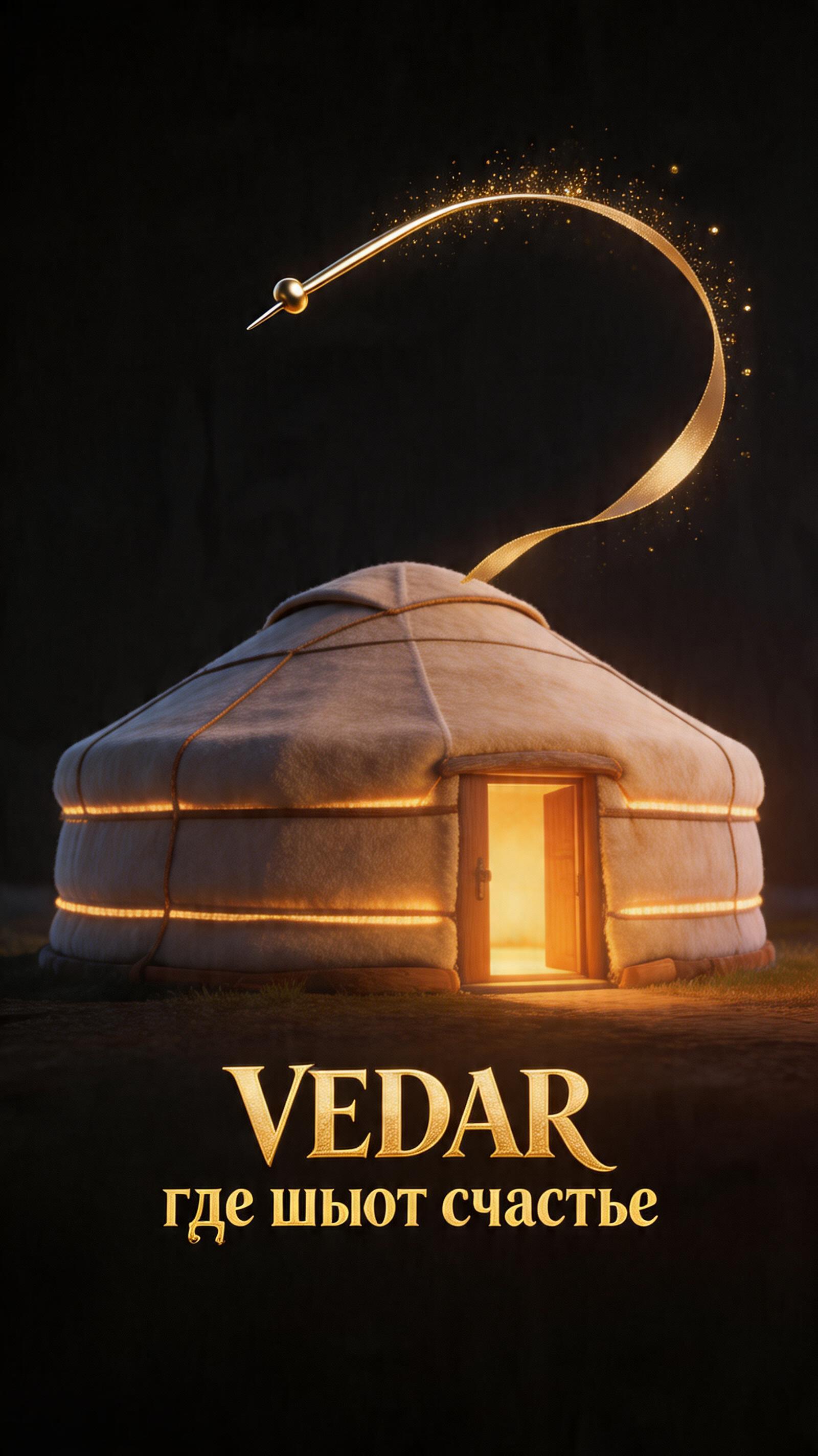 Pixar-style 3D animation movie poster. A deep black background. In the center, a stylized silhouette of a traditional Buryat yurt (Ger) glowing with a soft, warm amber light from within. A shimmering golden needle is flying in a perfect cinematic arc over the yurt, leaving behind a trail of luminous, magical silk thread and glittering golden dust (pixie dust style). Below the yurt, the word "VEDAR где шьют счастье" is written in an elegant, custom calligraphic script, reminiscent of Disney's Waltograph but with sharp, vertical strokes inspired by Mongolian script. The letters are made of solid polished gold, reflecting the light. Cinematic lighting, soft subsurface scattering on the yurt’s felt texture, 8k resolution, magical and heartwarming atmosphere.