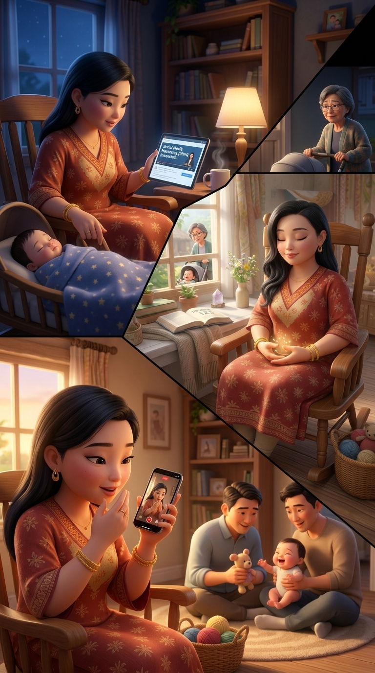 Art style: Стиль Pixar, 3D-анимация, тёплый, вдохновляющий.... Динамичный монтаж: 1. Ночь, Ханда одной рукой качает колыбель, в другой — планшет с онлайн-лекцией по SMM. 2. День, Мама гуляет с коляской во дворе, а Ханда в это время медитирует, сидя у окна (визуальный эффект легкого свечения вокруг ее рук). 3. Вечер, Ханда шепотом записывает видео для соцсетей, пока Муж на заднем плане тихо играет с ребенком. Стиль: вдохновляющий, динамичный, с быстрыми сменами кадров. ━━━━━━━━━━━━━━━━━━━━━━━━━━━━━━━━━━━━━━ FINAL STYLE ENFORCEMENT (this is the authoritative rendering directive — it overrides any style wording elsewhere in the prompt): Render this image entirely in "Стиль Pixar, 3D-анимация, тёплый, вдохновляющий..." style. Match the lighting grammar, material response, colour science, level of realism / stylisation, line weight, and shading model typical of "Стиль Pixar, 3D-анимация, тёплый, вдохновляющий...". Keep the subject, composition, camera angle, lighting direction, and colour palette from the description above — but EVERY surface, skin, fabric, material, and environmental element must be rendered in the "Стиль Pixar, 3D-анимация, тёплый, вдохновляющий..." idiom, not in any other medium. Character appearance reference (MUST match exactly): - Ханда: Молодая женщина с мягкими чертами овального лица и светлой кожей с теплым подтоном. У нее длинные, густые, волнистые черные волосы, спадающие на плечи, и добрые темно-карие глаза. Она одета в традиционное терракотовое платье с изящными золотыми цветочными узорами и каймой. На запястьях надеты тонкие золотые браслеты, на пальце — кольцо, а в ушах — маленькие золотые серьги. Выражение лица безмятежное и нежное с легкой любящей улыбкой. Она сидит, бережно прижимая к груди младенца, завернутого в голубое одеяло с принтом из звезд. - Мама: Strong rule: style --- 3D Pixar ---. Женщина 50-55 лет, азиатской внешности. Заботливое, немного тревожное выражение лица. - Ребёнок: Младенец 0-6 месяцев, символ новой жизни и вдохновения.